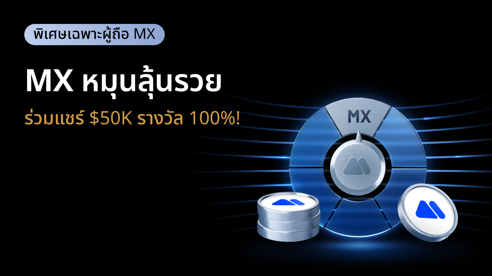 รู้สึกโชคดีไหม? กิจกรรมสุดพิเศษสำหรับผู้ถือ MX กลับมาแล้วกับ MX หมุนลุ้นรวยที่ทุกการหมุนคือการรับรางวัล! รวมของรางวัลมูลค่า $50,000 กำลังรอคุณอยู่ เปลี่ยนภารกิจง่าย ๆ ให้เป็นโอกาสลุ้น MX — อย่าพลาดความสนุก เพราะการหมุนของคุณอาจเป็นการหมุนที่เปลี่ยนเกม!