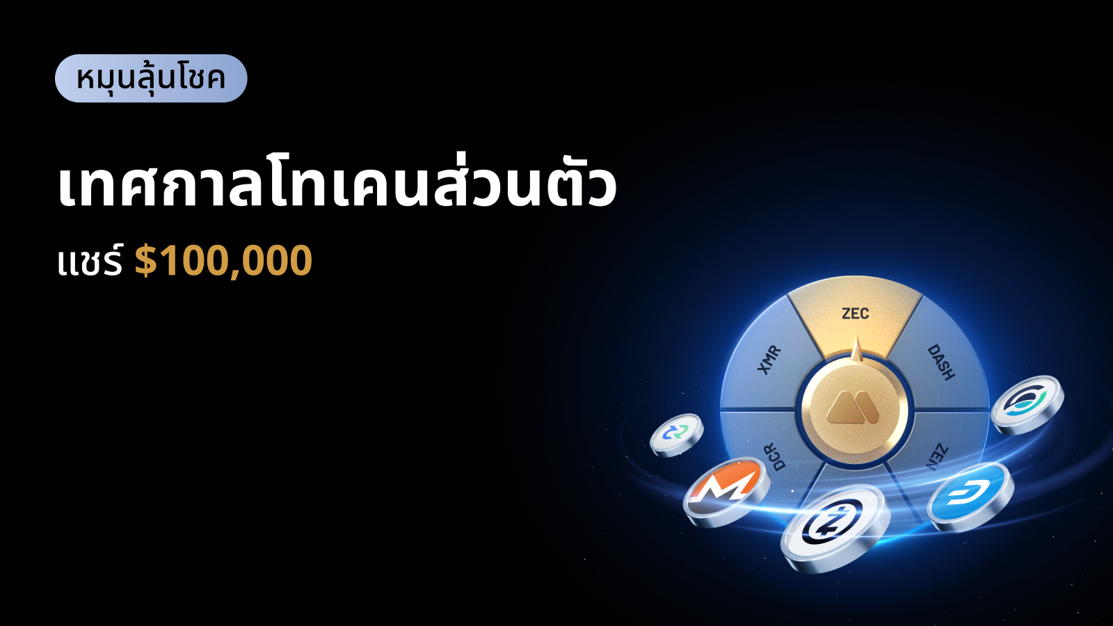 เฉลิมฉลองพลังแห่งความเป็นส่วนตัวไปกับเทศกาลโทเคนส่วนตัวของ MEXC! เพียงทำภารกิจง่าย ๆ หมุนวงล้อ แล้วรับส่วนแบ่งจากโทเคนส่วนตัวชั้นนำมูลค่ารวม $100,000 ไม่ว่าจะเป็น ZEC, XMR, DASH, DCR และอีกมากมาย!