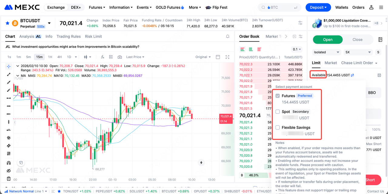 หากจำนวนเงินที่ต้องการสำหรับคำสั่งเกินยอดคงเหลือในบัญชีฟิวเจอร์ส ระบบจะใช้สินทรัพย์จากบัญชีอื่นที่คุณเลือกโดยอัตโนมัติ ระบบจะคำนวณจำนวนเงินที่ต้องการก่อน หากเลือกบัญชีออมทรัพย์แบบยืดหยุ่น ระบบจะไถ่ถอนสินทรัพย์โดยอัตโนมัติ หากเลือกบัญชีสปอต ระบบจะโอนสินทรัพย์โดยอัตโนมัติ หลังจากที่ตรงตามข้อกำหนดมาร์จินแล้ว ระบบจะดำเนินการสั่งซื้อเพื่อเปิดโพสิชันต่อไป
