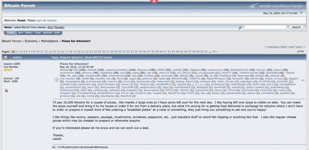 ในเดือนพฤษภาคม 2010 เมื่อ Bitcoin ยังอยู่ในช่วงเริ่มต้น Laszlo Hanyecz ได้โพสต์ข้อความบนฟอรัม Bitcointalk ซึ่งจะเปลี่ยนแปลงประวัติศาสตร์ของสกุลเงินดิจิทัลไปตลอดกาล