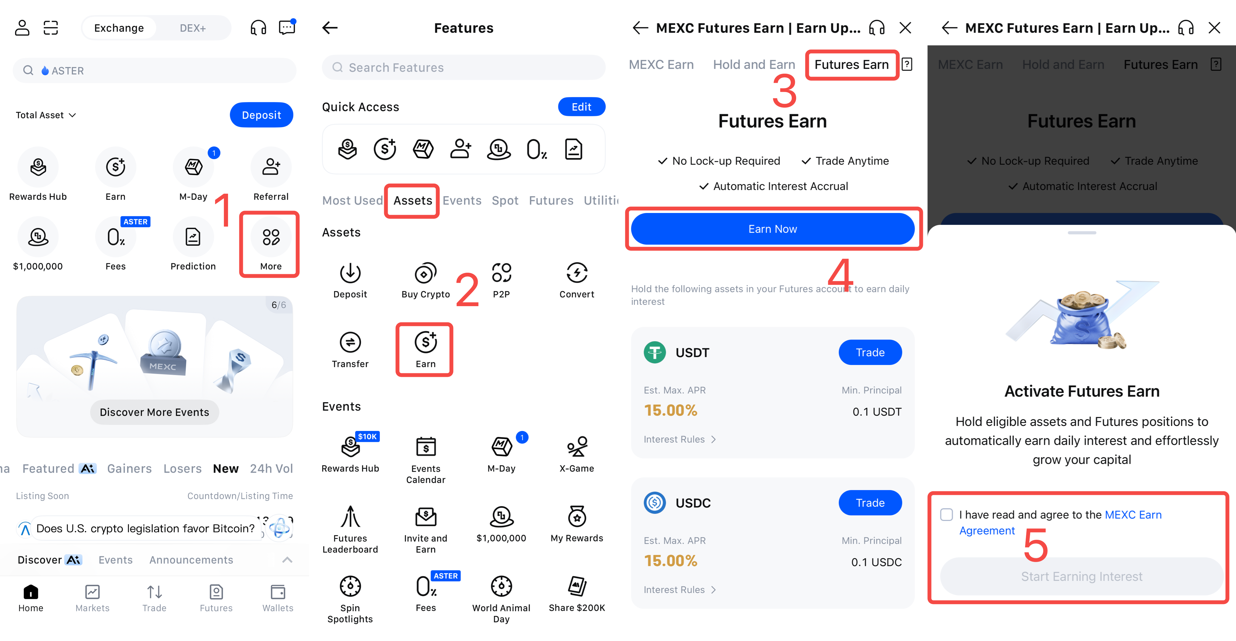 5) ทำเครื่องหมายในช่องข้อตกลงและแตะปุ่มเริ่มรับดอกเบี้ยเพื่อดำเนินการเปิดใช้งานฟีเจอร์ ฟิวเจอร์ส Earn ให้เสร็จสมบูรณ์