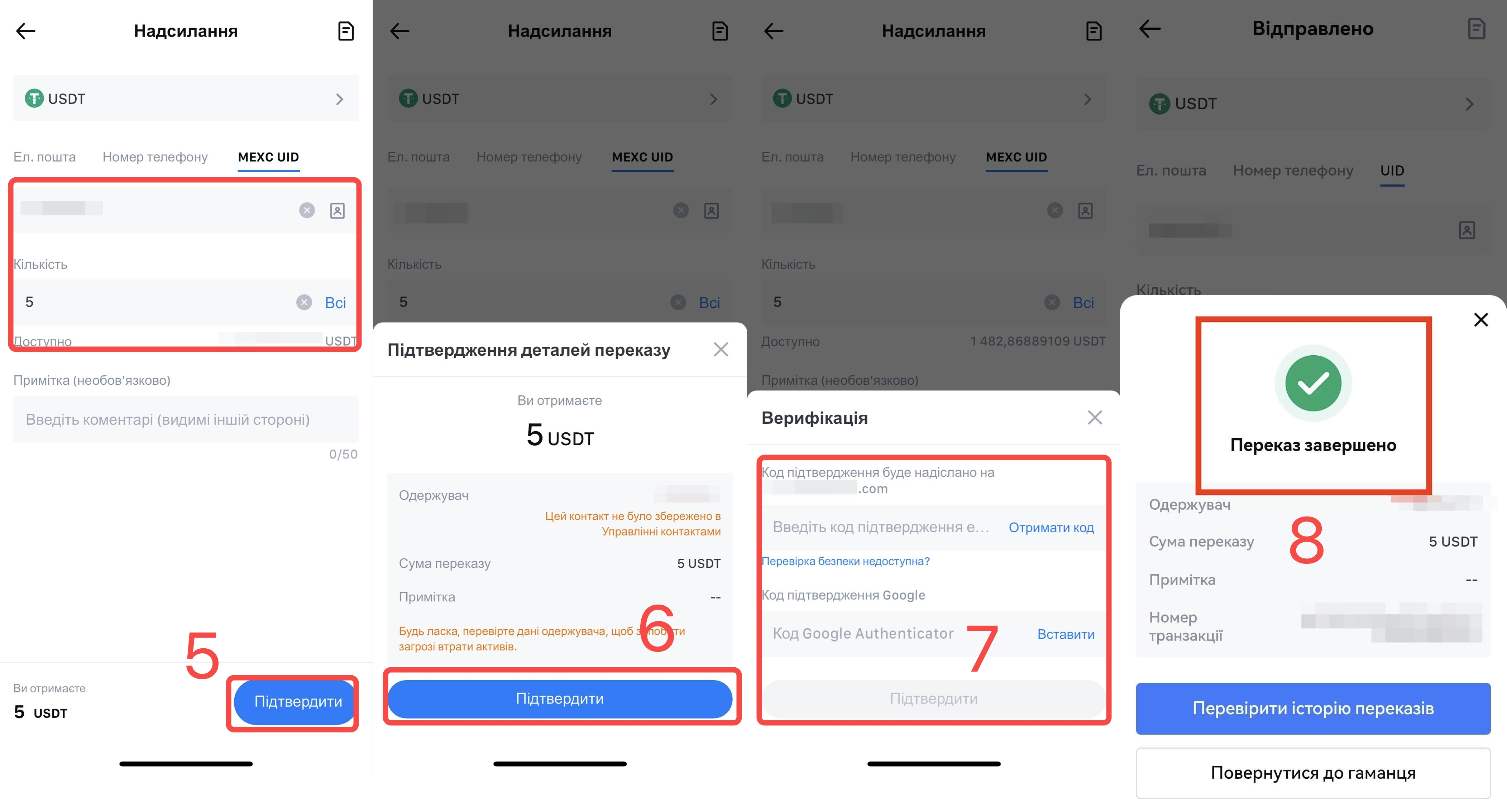 5) Заповніть інформацію про акаунт одержувача та кількість, яку потрібно надіслати. Наразі існує 3 способи переказу: [Ел. пошта], [Номер телефону] або [UID].