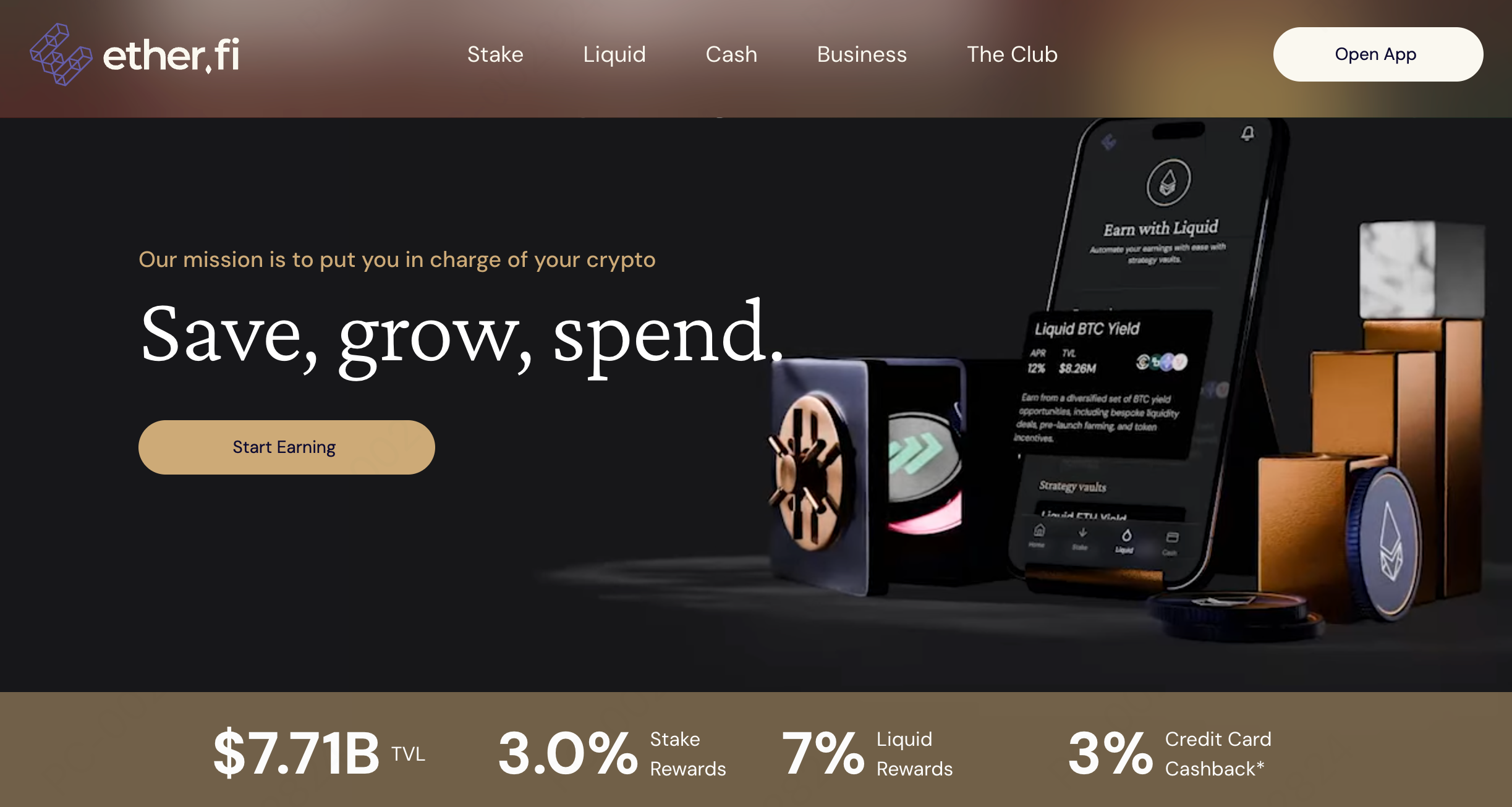 Cash представляє трансформаційну некастодіальну платіжну картку в криптовалюті. Користувачі можуть легко підключити свій інвестиційний портфель ether.fi до цієї картки, що дозволяє здійснювати безперешкодні транзакції у більш ніж 100 мільйонів мерчантів, які підтримують Visa по всьому світу. Від повсякденних покупок, таких як кава, до витрат на подорожі, таких як оренда автомобілів та розміщення в розкішних готелях, всі транзакції зручно керуються через одну картку. Платформа наразі винагороджує користувачів щедрим кешбеком у розмірі 3% на всі покупки й ідеально інтегрується з екосистемами Apple Pay та Google Pay. Важливо, що ця картка використовує інноваційну некастодіальну архітектуру, надаючи користувачам повний контроль над їхніми активами у будь-який час.