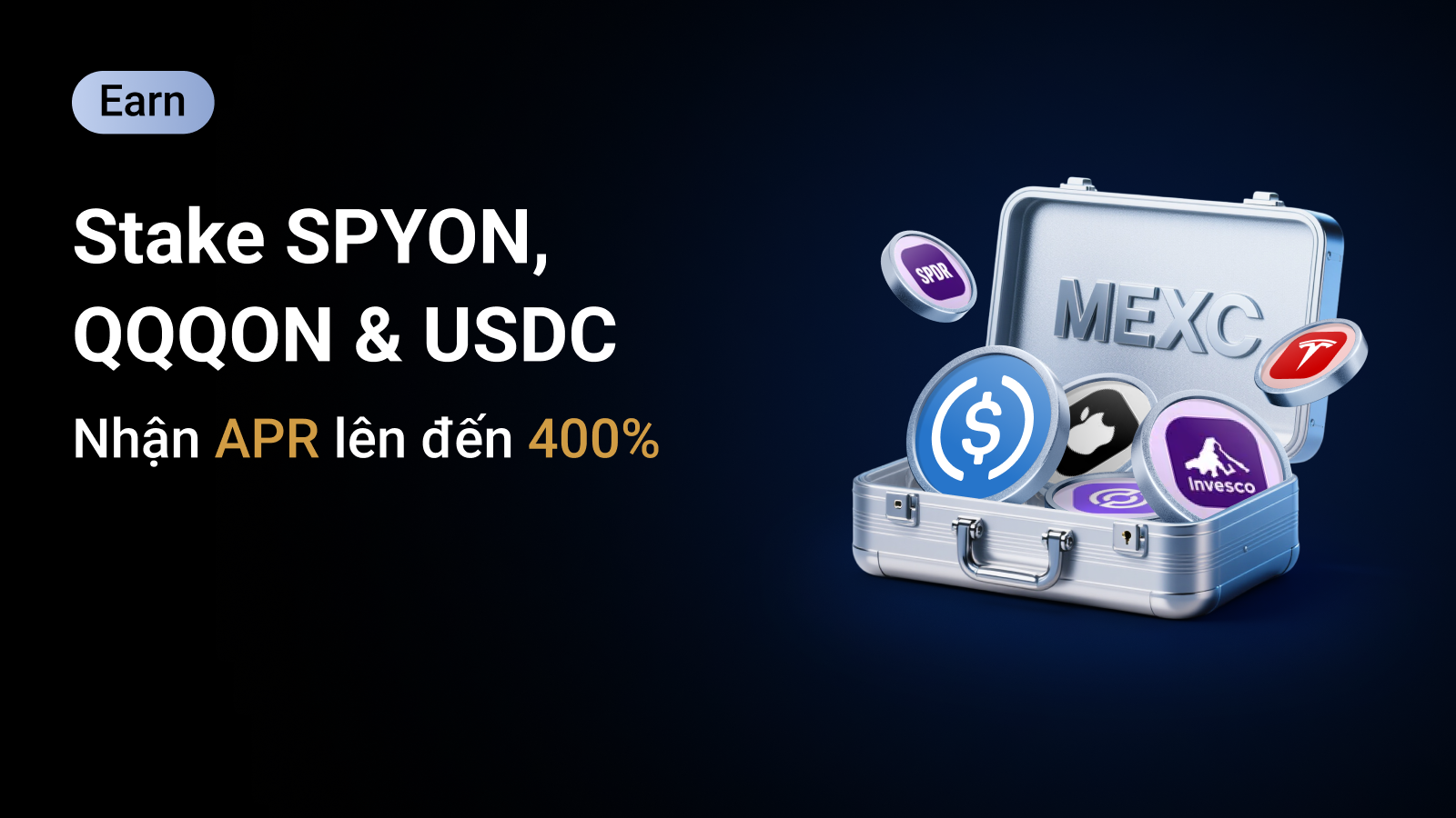 MEXC hân hạnh ra mắt Lễ hội phần thưởng staking, với danh mục đặc biệt là Futures cổ phiếu được token hóa. Stake S&P 500 ETF (SPY, token hóa thành SPYON), NASDAQ 100 ETF (QQQ, token hóa thành QQQON) hoặc USDC, và nhận phần thưởng tương ứng bằng Apple (AAPL, token hóa thành AAPLON), Tesla (TSLA, token hóa thành TSLAON) và Circle (CRCL, token hóa thành CRCLON).