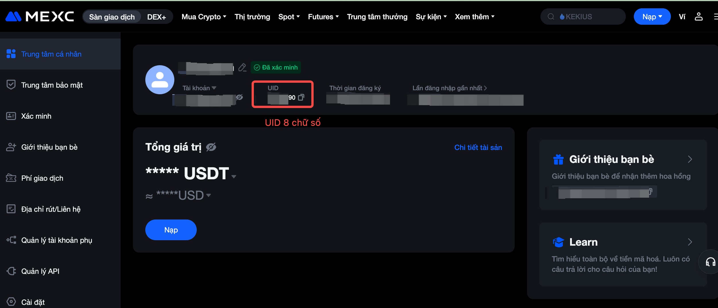 Đăng nhập vào MEXC, vào mục “Biểu tượng người dùng” và sao chép UID của bạn.