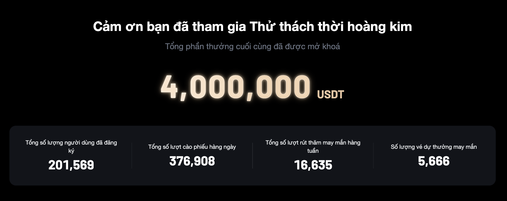 Cảm ơn bạn đã khiến Thử thách thời hoàng kim trở thành một sự kiện đáng nhớ! Sau cuộc thi gay cấn và kịch tính, tràn đầy năng lượng và sự mong đợi, kết quả đã chính thức được công bố. Với tổng cộng 201,569 người tham gia, sự kiện lần này đã mở khoá tổng phần thưởng lên đến 4,000,000 USDT. Giờ đây, khoảnh khắc mà tất cả đều chờ đợi - Cùng vinh danh những người chiến thắng đã giành vị trí cao nhất!