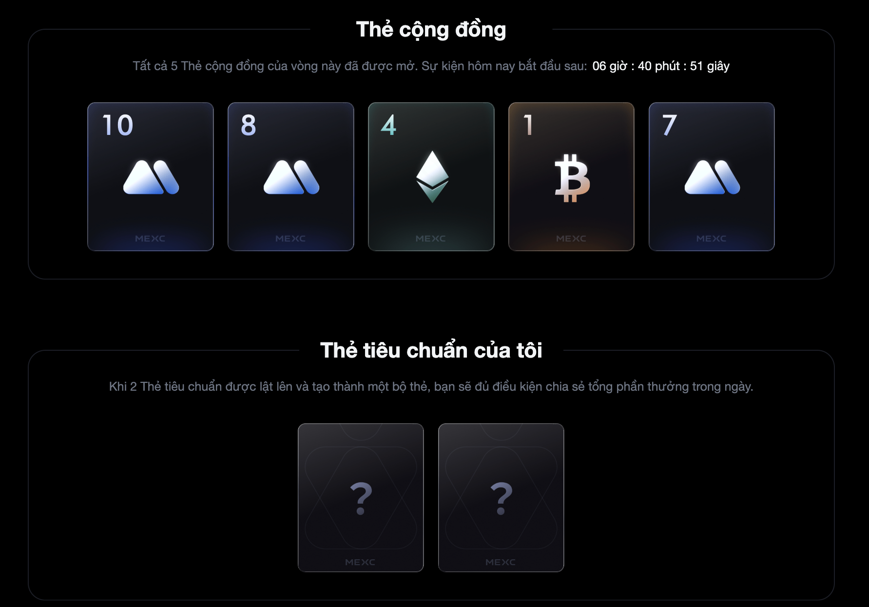 Sẵn sàng cho Lễ hội lật thẻ MEXC - thử thách thu thập thẻ nơi mỗi lần lật thẻ đưa bạn đến gần hơn với cơ hội chia sẻ tổng phần thưởng hấp dẫn 5,000,000 USDT. Giao dịch Futures 5,000 USDT mỗi ngày để tham gia, thu thập thẻ và nhận thưởng lớn!