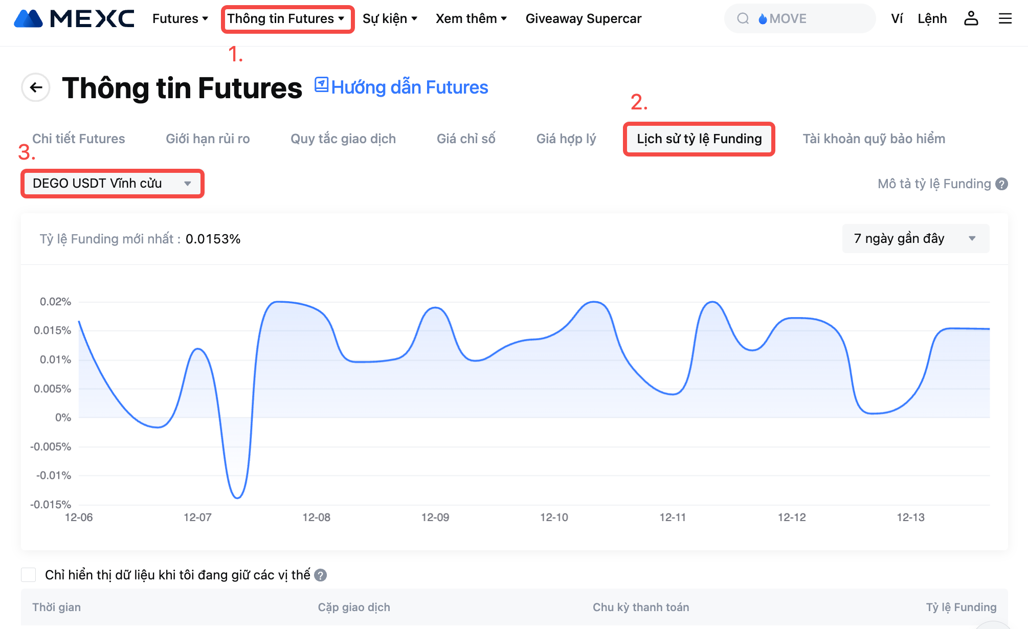 Để biết chi tiết tỷ lệ Funding mới nhất, vui lòng tham khảo Thông tin Futures - Lịch sử tỷ lệ Funding.