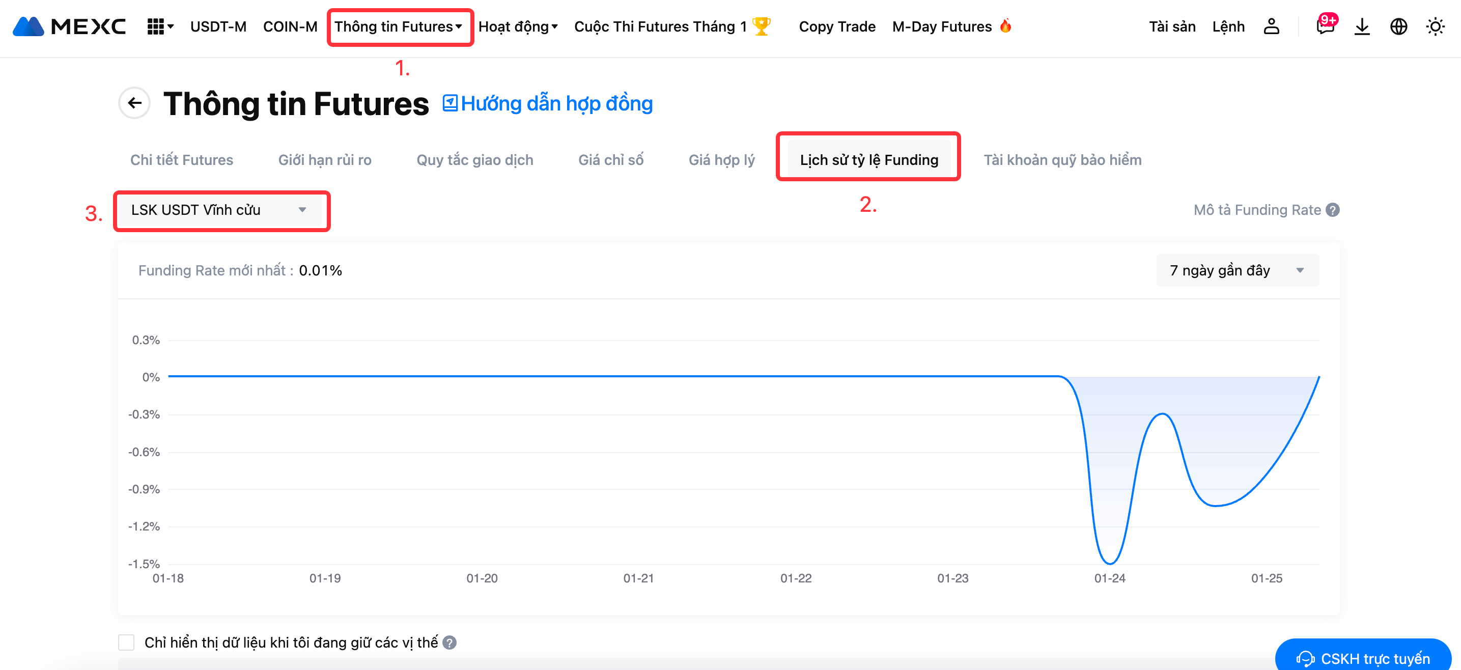 Để biết chi tiết tỷ lệ Funding mới nhất, vui lòng tham khảo Thông tin Futures - Lịch sử tỷ lệ Funding.