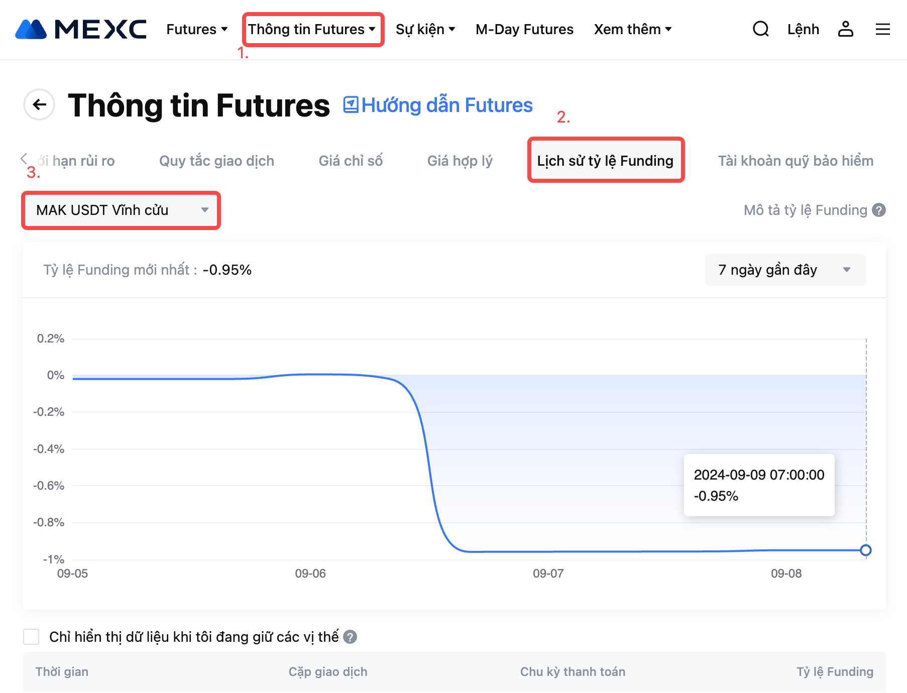 Để biết chi tiết tỷ lệ Funding mới nhất, vui lòng tham khảo Thông tin Futures - Lịch sử tỷ lệ Funding.