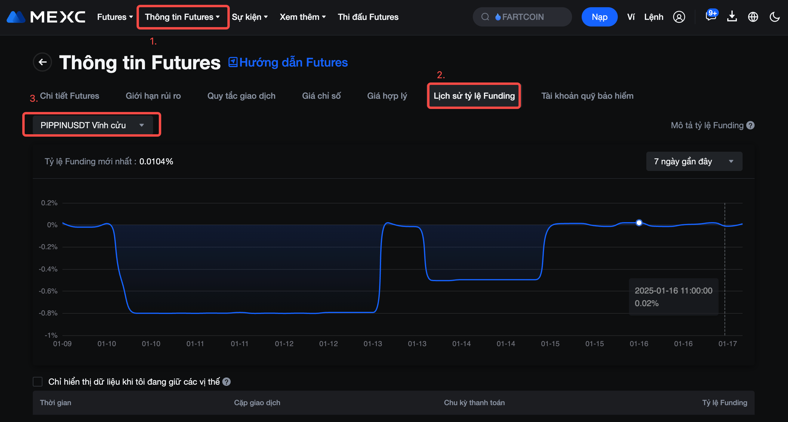 Để biết chi tiết tỷ lệ Funding mới nhất, vui lòng tham khảo Thông tin Futures - Lịch sử tỷ lệ Funding.