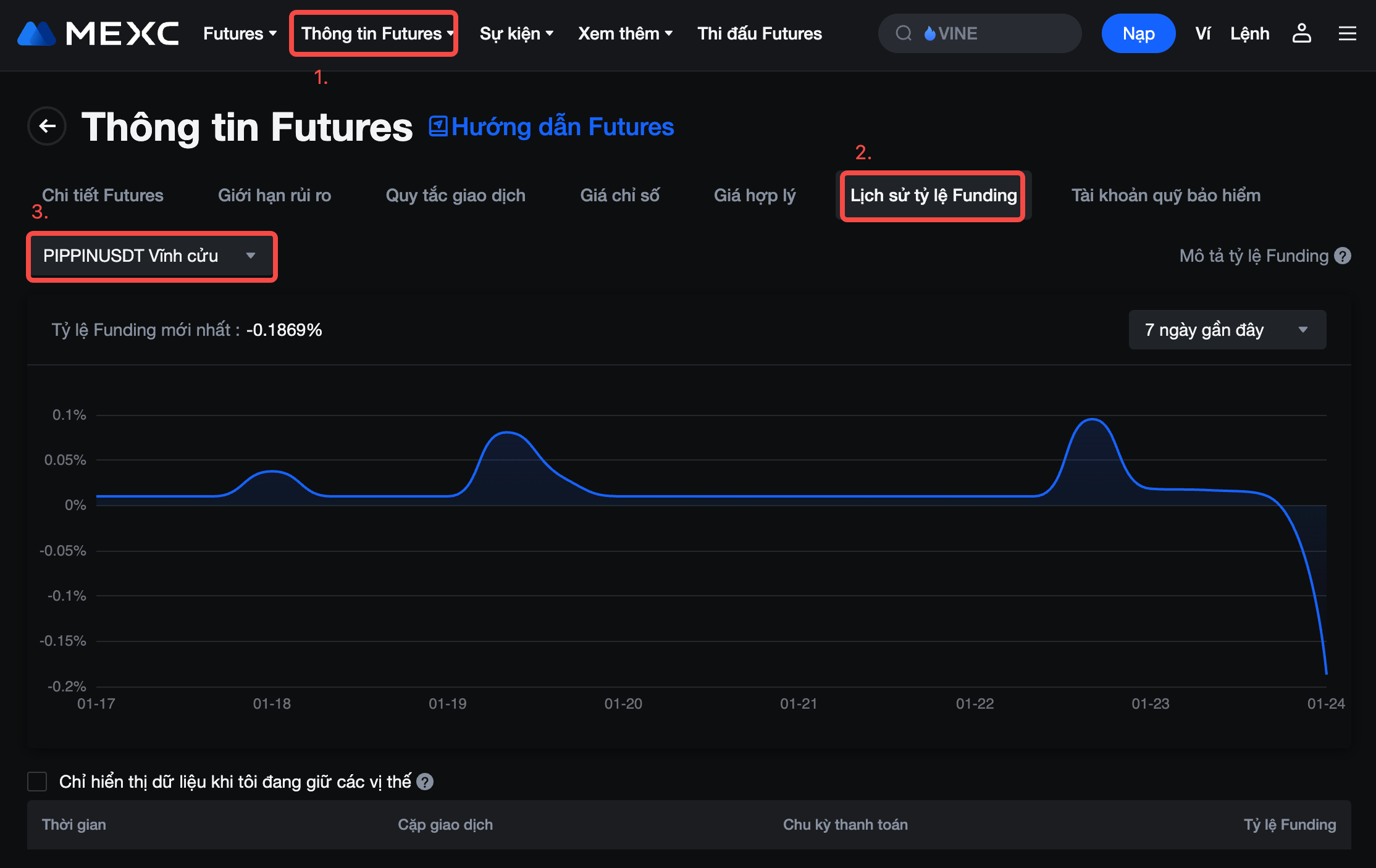 Để biết chi tiết tỷ lệ Funding mới nhất, vui lòng tham khảo Thông tin Futures - Lịch sử tỷ lệ Funding.