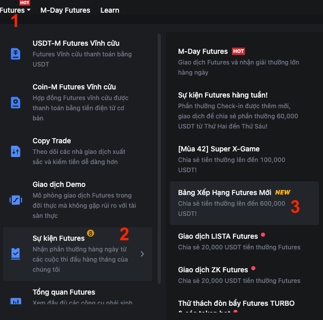 Cách 1: Truy cập trang web chính thức của MEXC (www.mexc.com), nhấn vào [Futures] trên thanh điều hướng, chọn [Sự kiện Futures] và [Bảng Xếp Hạng Futures Mới].