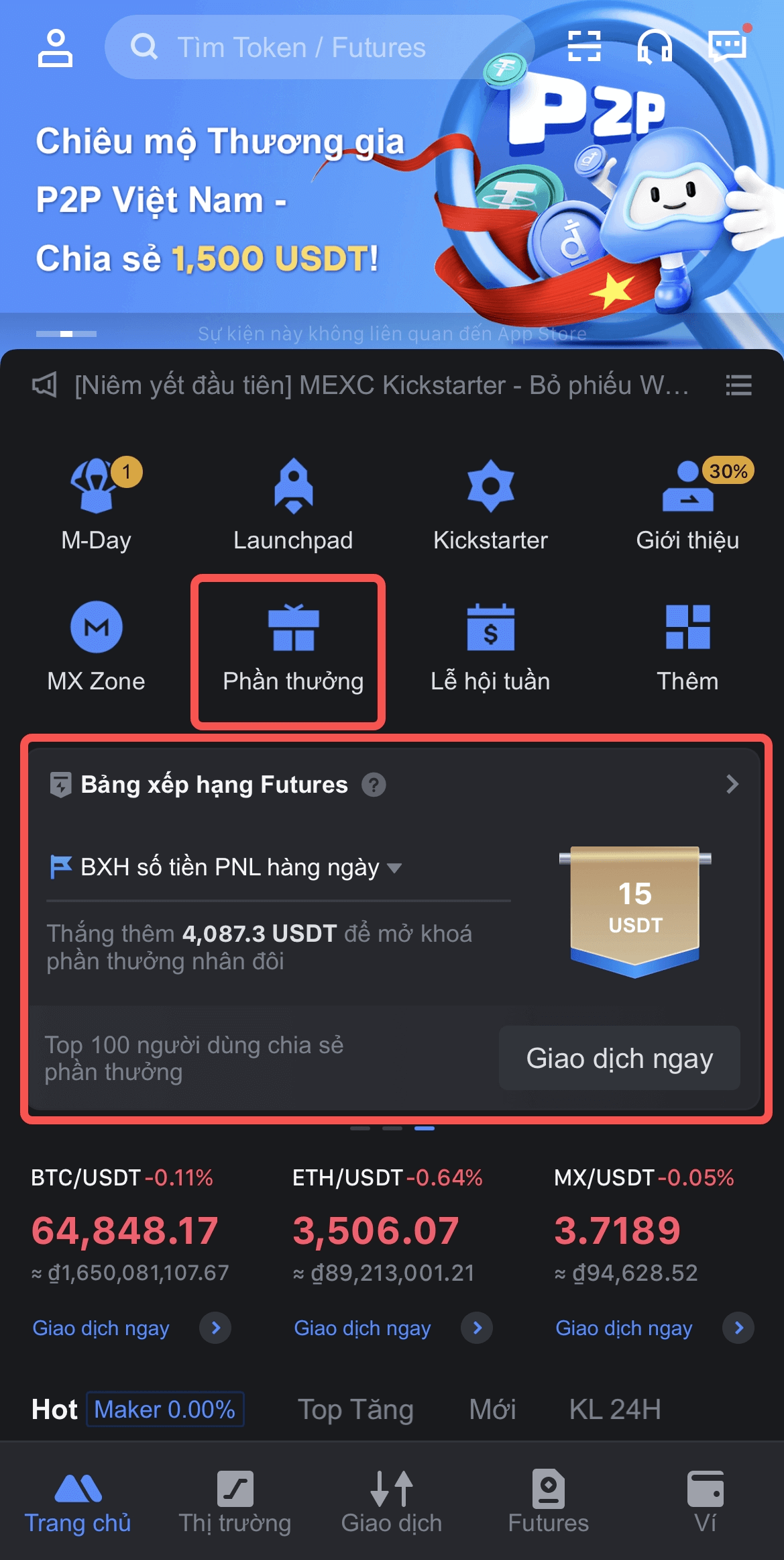 Cách 2: Vào trang chủ và vuốt sang phải để chuyển sang thẻ sự kiện [Bảng xếp hạng Futures] (Đối với phiên bản App 4.7.4 trở lên).