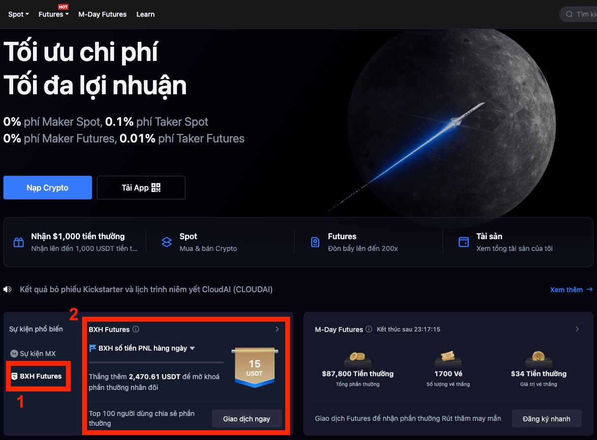 Cách 2: Truy cập trang chủ web chính thức của MEXC (www.mexc.com), nhấn vào [BXH Futures] trên thẻ sự kiện.