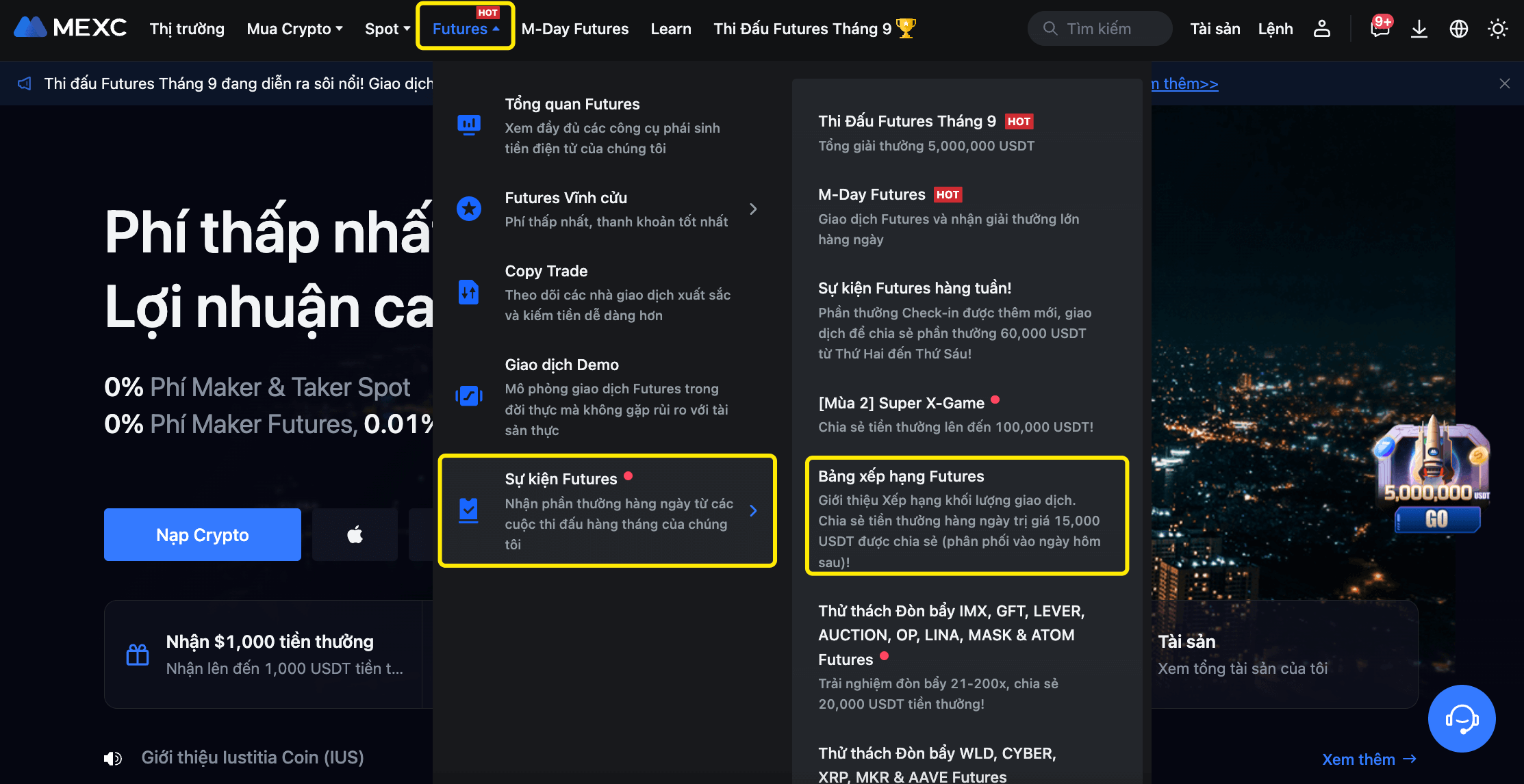 Phiên bản web: Truy cập trang chủ MEXC (www.mexc.com), nhấp vào [Futures] trên thanh điều hướng và nhấp vào [Bảng xếp hạng Futures].