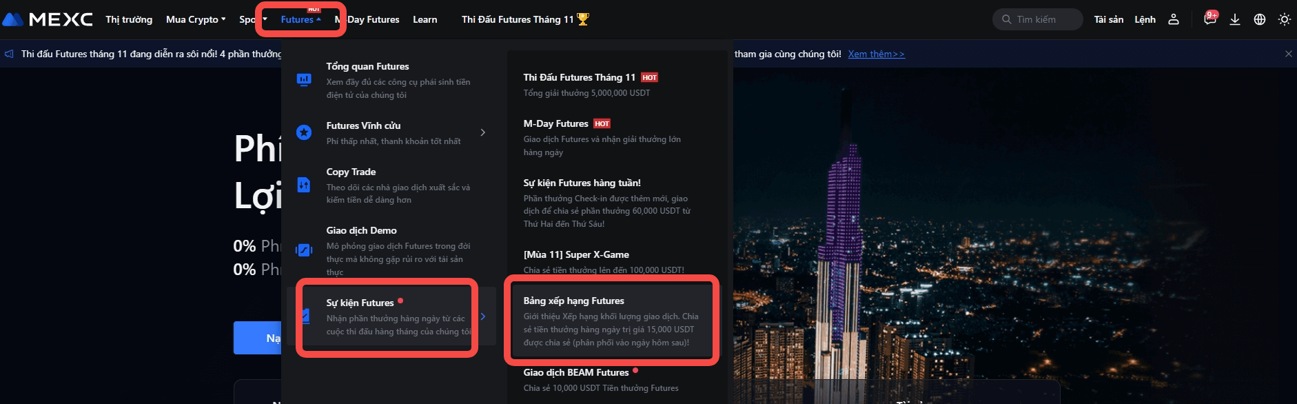 Phiên bản web: Truy cập trang chủ MEXC (www.mexc.com), nhấp vào [Futures] trên thanh điều hướng và nhấp vào [Bảng xếp hạng Futures].