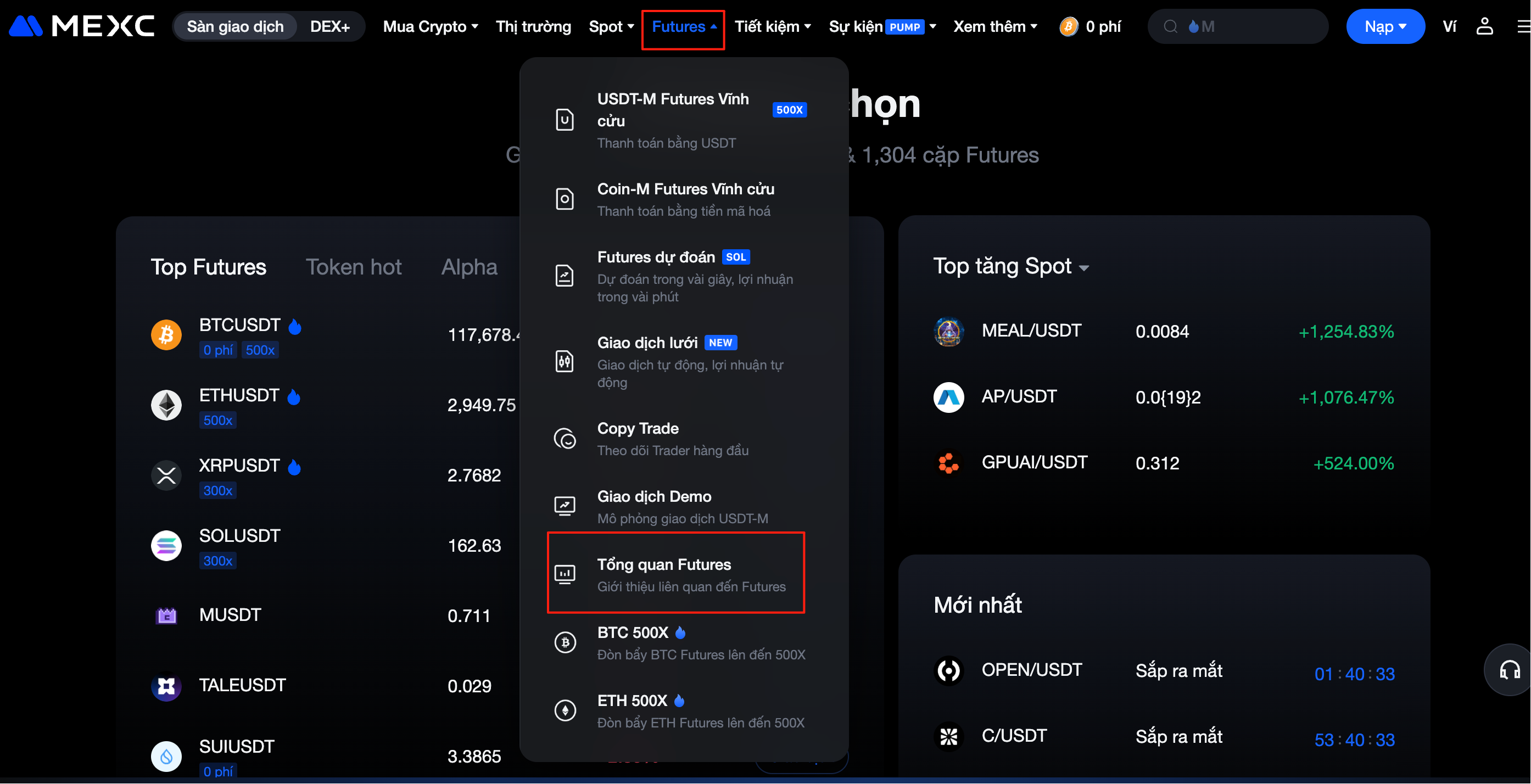 1) Đăng nhập vào trang web chính thức của MEXC và điều hướng đến Futures → Tổng quan Futures.