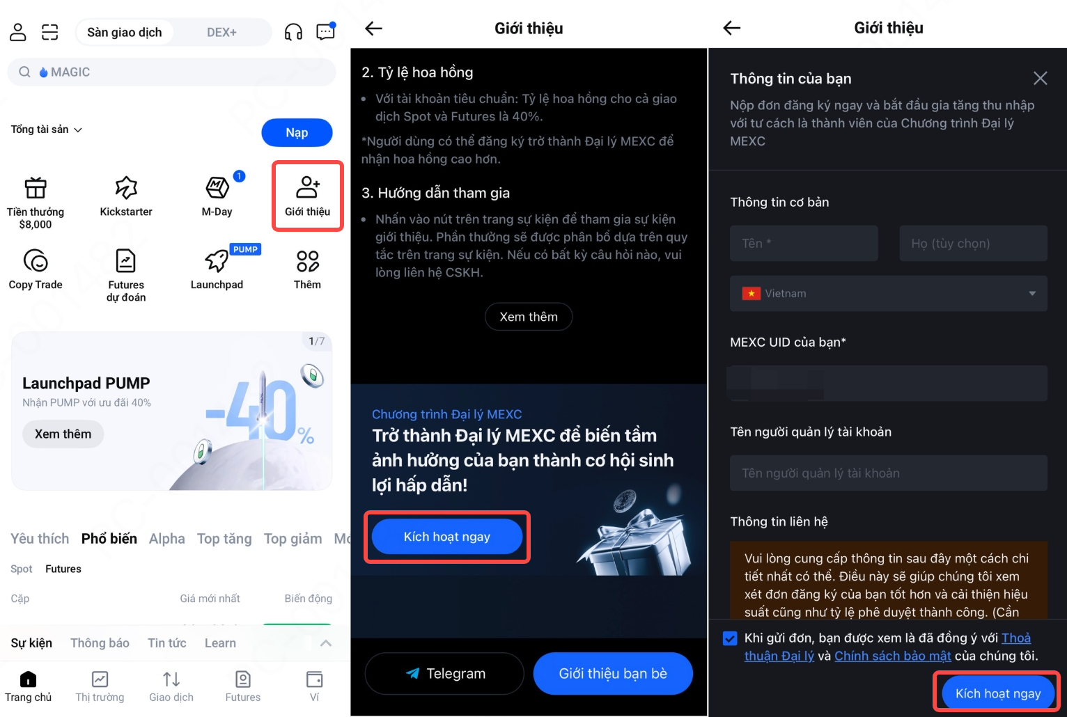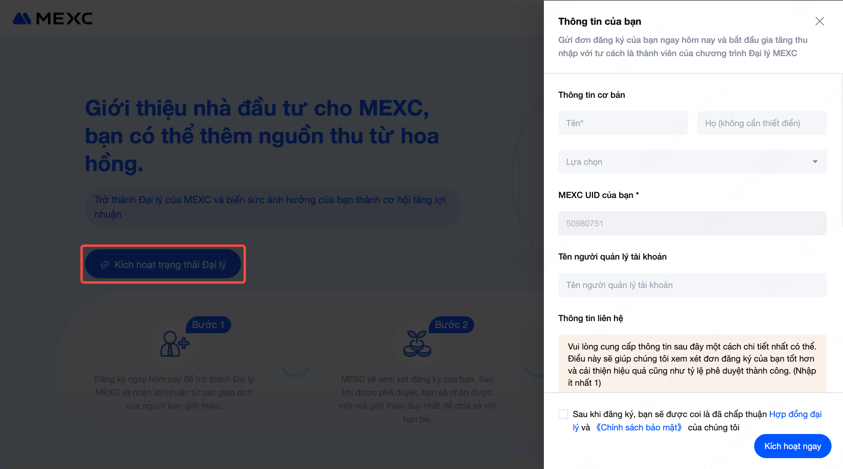 2) Cuộn xuống cuối trang để tìm Chương trình Đại lý MEXC, sau đó nhấn vào Kích hoạt ngay.