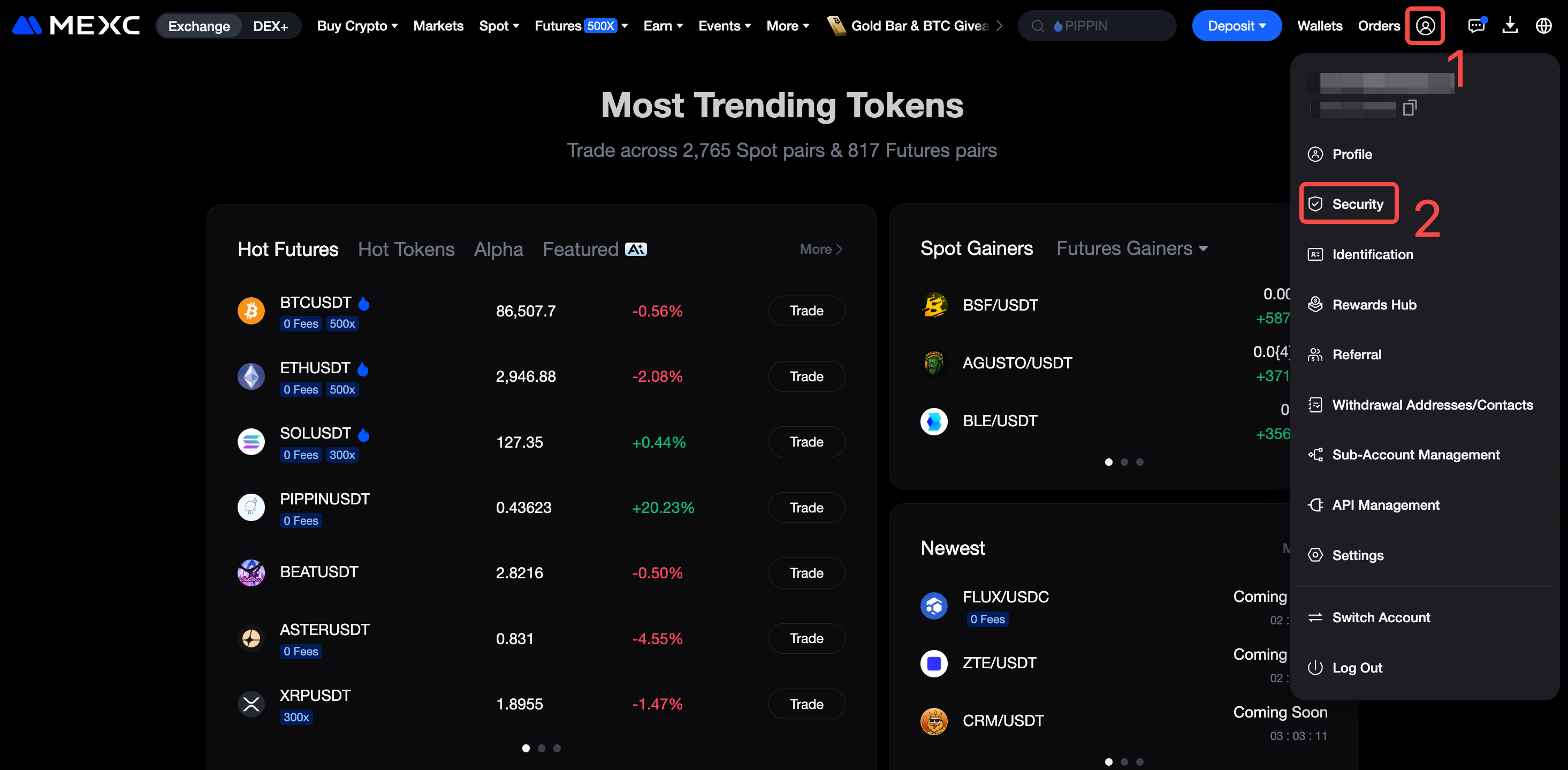 Truy cập trang web chính thức của MEXC và đăng nhập vào tài khoản. Tại menu của Trung tâm cá nhân, nhấn vào Trung tâm bảo mật.
