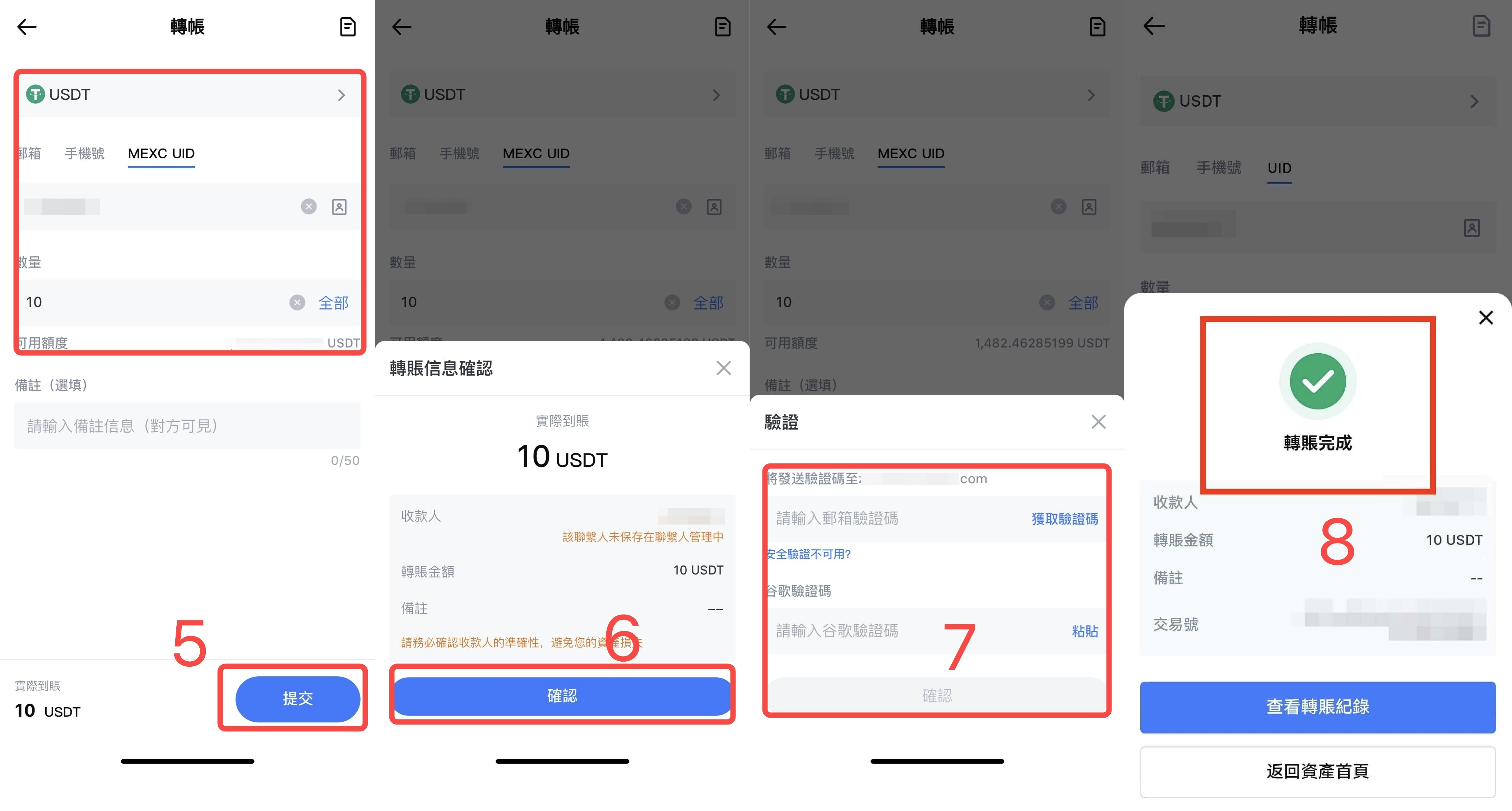 3)选择【MEXC 用户】,目前支持【邮箱】、【手机号码】、【MEXC UID】三种转账方式,填写接收转账的账户信息。