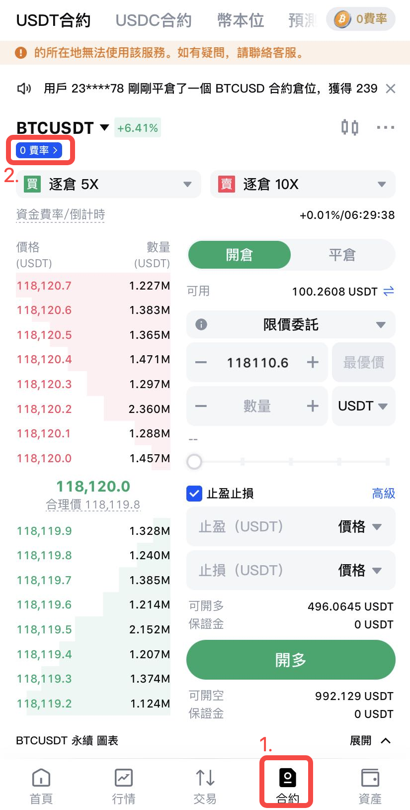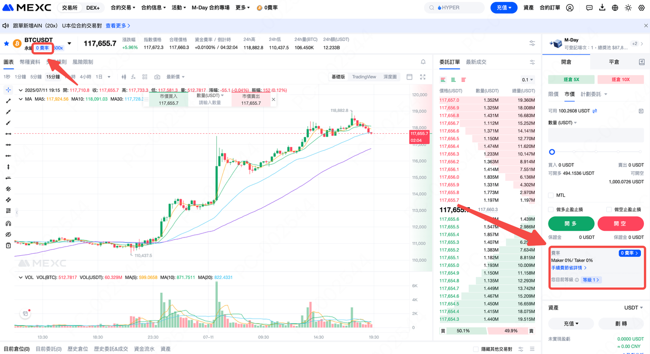 當總交易量 > 9,000,000 USDT 時,活動期間,繼續交易 BTC 永續合約(BTCUSDT 和 BTCUSDC),則可享有: 掛單手續費:0% 吃單手續費:0.04% 30 天交易量採用滾動式計算機制並即時更新。系統將隨時核查您過去 30 天內 BTC 永續合約(BTCUSDT 和 BTCUSDC)的總交易量,並據此確定適用費率。 無須報名,交易上述合約,立享零費率。 - 了解更多關於零費率狂歡節及活動交易對的資訊,請參考活動頁面。 - 活動期間,以上合約交易對不再享有手續費優惠活動; - 活動期間,以上合約交易對的交易量將不計入合約活動(如領 8,000 USDT、M-Day 合約專場、超級X遊戲、合約風雲榜、Futures Hotspot 等); - 本活動僅限特定地區的部分使用者參與(新用戶或小額交易用戶等)。參與資格和有效週期是動態調整的,請您登入帳戶後以費率頁面或交易頁面的費率為準。 - MEXC 保留本次活動的最終解釋權。如有任何問題,請聯絡客服。 登入帳戶後,您也可以透過以下方式查看費率 Web 端 進入合約交易頁,查看幣對下是否顯示「0 費率」標籤或在右下角查看具體費率 App 端 點選選單列【合約】進入合約頁面,搜尋 BTC 永續交易對,在交易對下方查看是否有「0 費率」標籤。參與方式