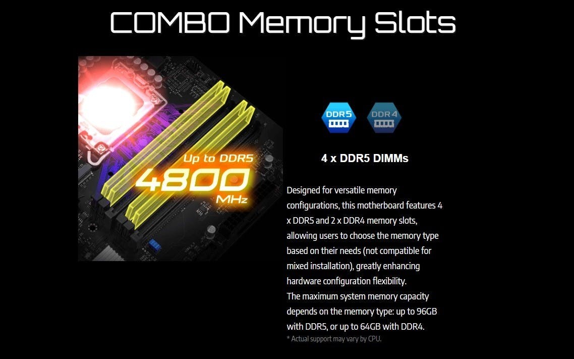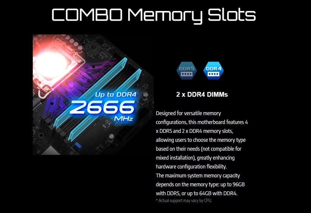 這是由於Intel的第12代Core至第14代Core仍可支援DDR4與DDR5兩種記憶體規格,這張主機板可選擇搭配4條最高時脈4800MHz、最大共96GB容量的DDR5,或是2條最高時脈2666MHz、最多共64GB容量的DDR4,但當然兩種記憶體無法混用,僅能選擇使用其中一種記憶體。