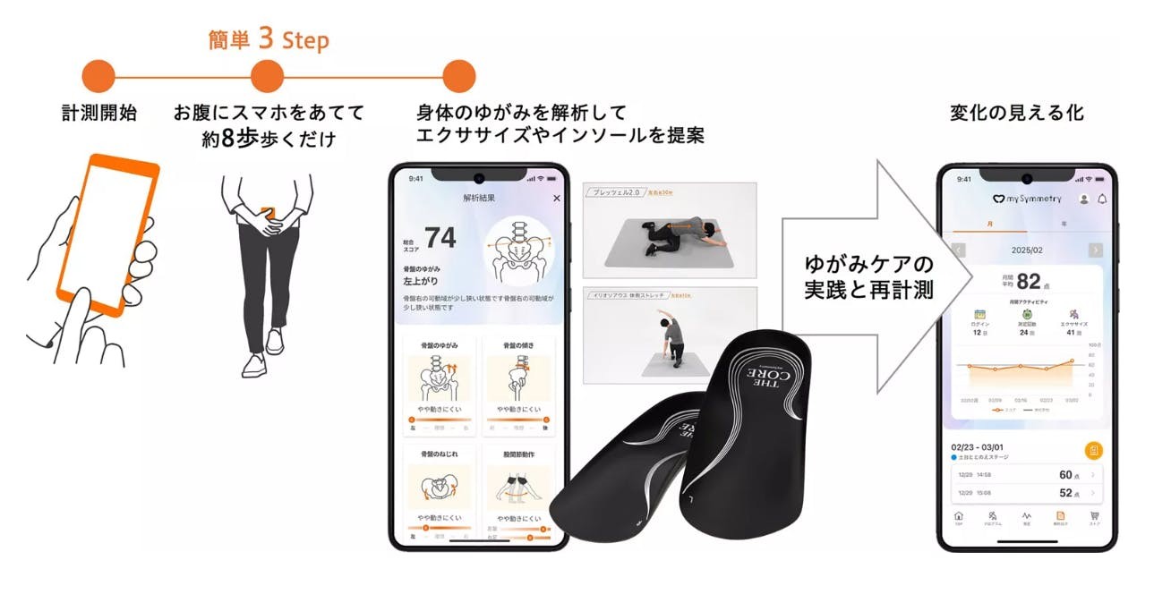 日本花王公司發表了一款名為「my Symmetry」的免費手機應用程式,其主要功能是測量及分析使用者的身體姿勢是否出現歪斜。使用者只需將智慧型手機放置於腹部位置,然後走8步,App即可即時確認姿勢的歪斜情況。程式的分析項目包含骨盆的歪斜、傾斜與扭轉,以及髖關節、膝蓋與腳踝的關節動作差異。