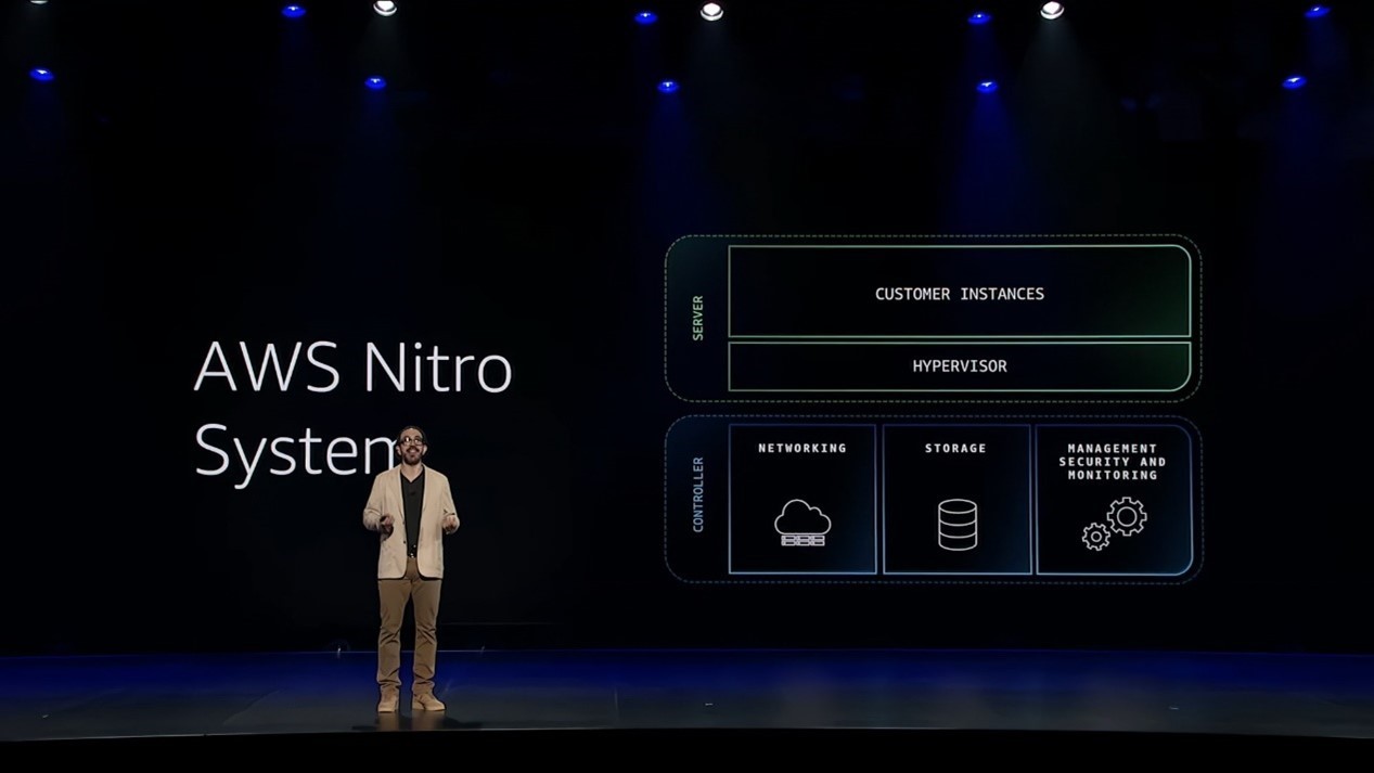 AWS 的自行研發晶片策略源於對這些核心屬性的深刻理解。Peter DeSantis 回顧了 2010 年 Amazon EC2 面對的虛擬化效能抖動問題。當時業界普遍認為虛擬化永遠無法達到裸機效能,但 AWS 透過深入優化,最終開發出 Amazon Nitro 系統,將虛擬化從伺服器轉移到專屬硬體,完全消除了抖動問題,效能甚至超越裸機。