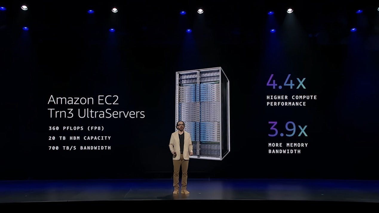 Peter DeSantis 展示了 Amazon EC2 Trn3 UltraServers 驚人的技術規格:144 顆 Amazon Trainium3 晶片橫跨兩個機架組合成單一 AI 超級電腦,提供 360 petaflops FP8 運算能力,比 Amazon Trn2 UltraServers 高 4.4 倍。20TB 高頻寬記憶體提供 700TB/s 記憶體頻寬,比前一代 高 3.9 倍。執行 GPT-OSS-120B 模型時,每兆瓦輸出 token 數是 Amazon Trainium2 的 5 倍以上。