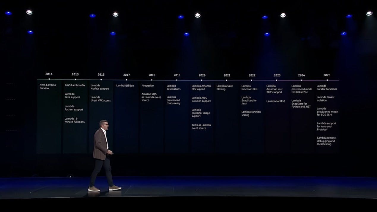 Dave Brown 講述了 AWS Lambda 誕生的故事。2013 年,一個小團隊提出了一個看似不可能的想法:開發者只需交付程式碼,無需管理伺服器。這個想法源於 Amazon S3 團隊處理圖片縮圖的需求,最終演變為 AWS Lambda 這項革命性服務。AWS Lambda 改變了應用程式開發模式,讓開發人員從程式碼而非伺服器開始思考。十年後,AWS Lambda 仍然是從想法到正式環境的最快路徑之一。