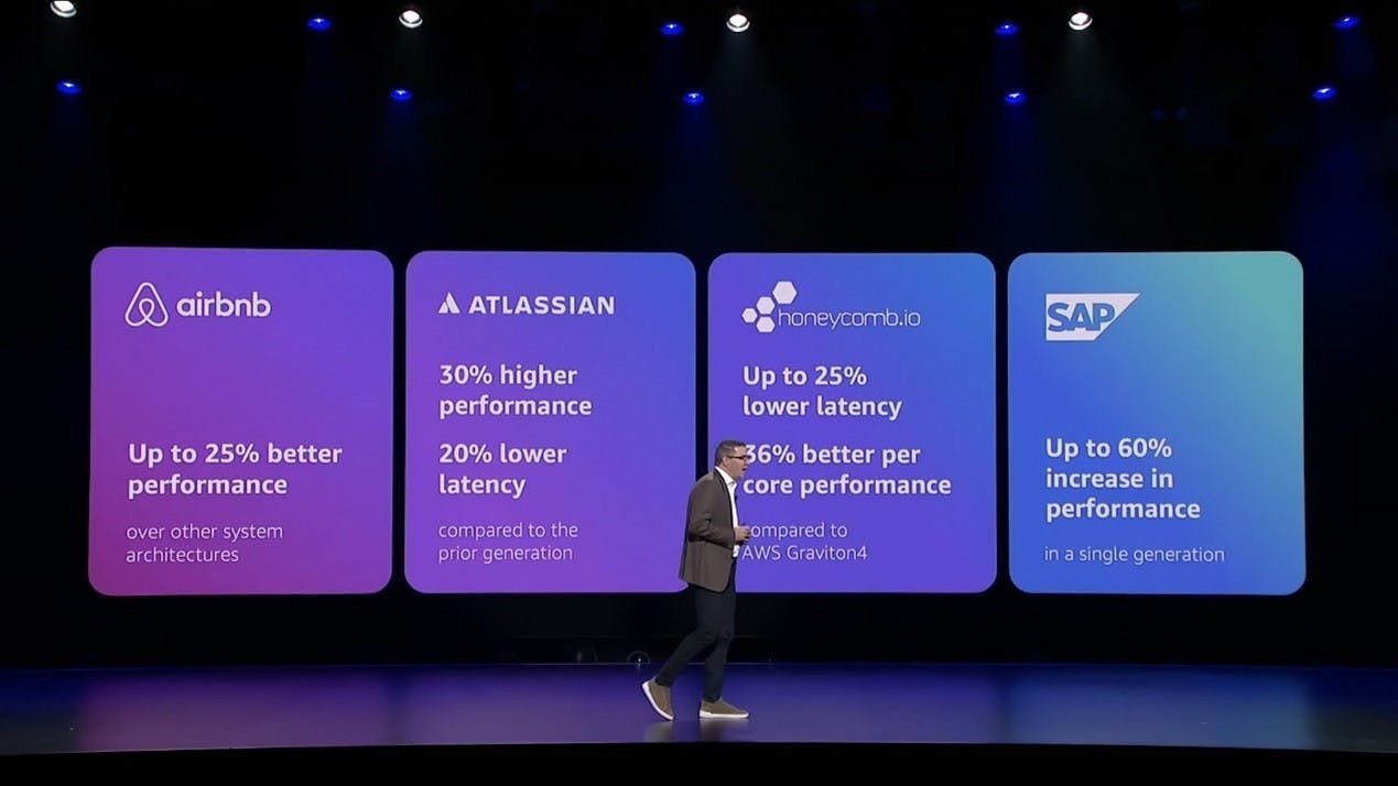 早期客戶已在正式環境中驗證了 AWS Graviton5 的卓越效能。Airbnb 實現了 25% 的效能提升,Atlassian 延遲降低 20%,Honeycomb 每核心效能提升 36%,SAP HANA OLTP 查詢效能提升 60%。