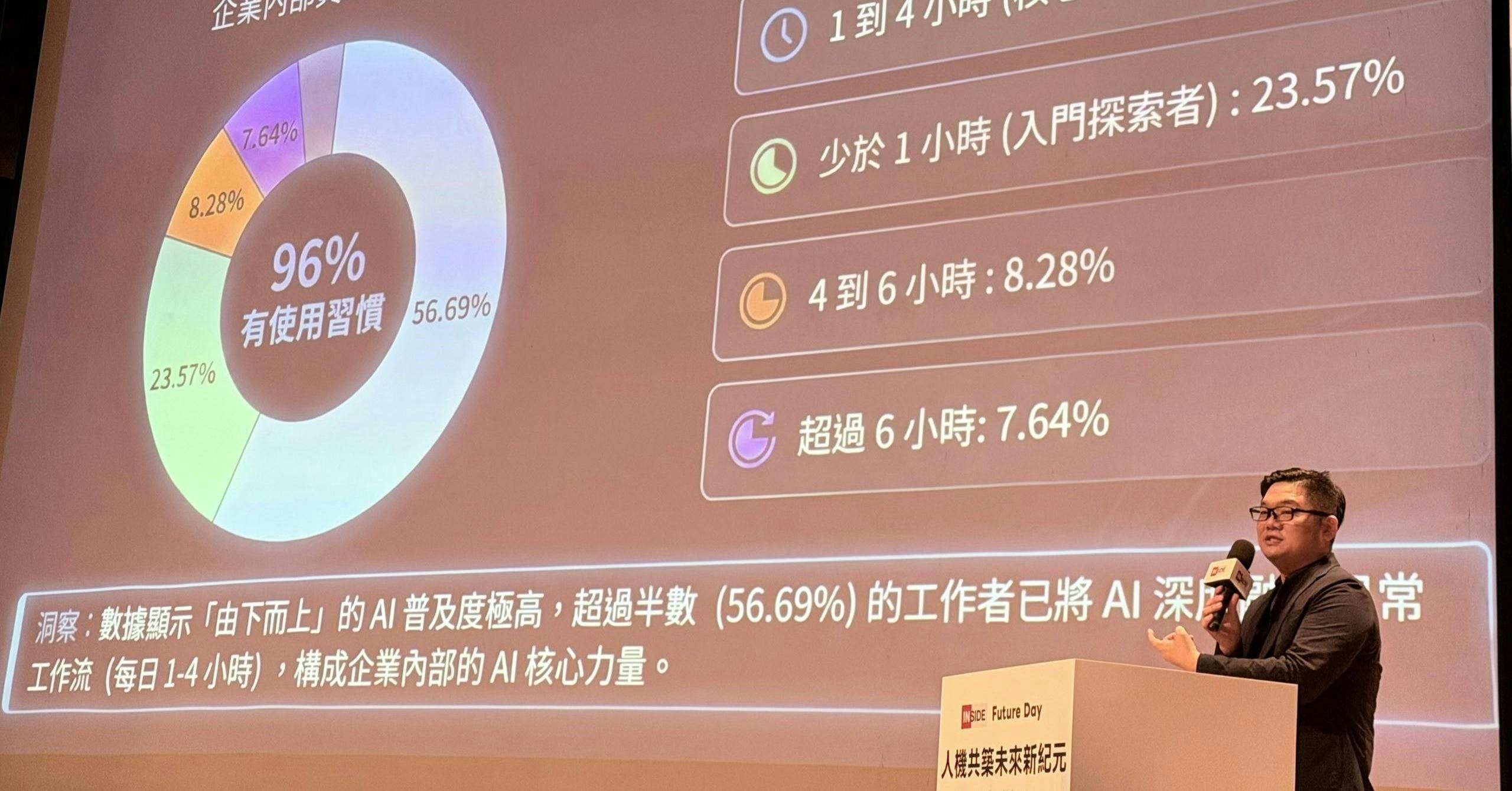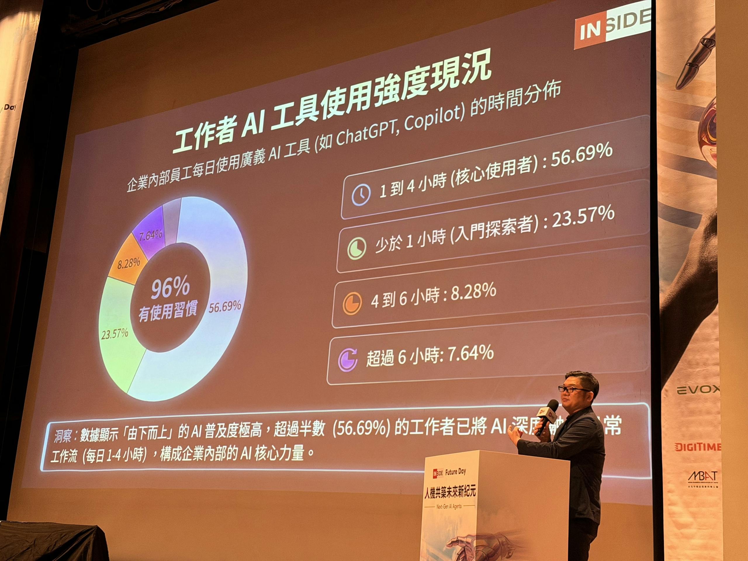 根據 INSIDE 的調查數據,高達 96% 的職場工作者表示他們已經使用過 AI 工具。不僅使用率普及,員工在使用時數上也相當投入。數據顯示,在每天八小時的工作中,使用 AI 1到4小時的比例接近六成。絕大多數人已將 AI 融入工作環節,甚至有 7% 的人使用時數超過六小時,顯示 AI 在提升工作效率方面已成為不可或缺的幫手。Photo Credit: INSIDE/Sisley 攝