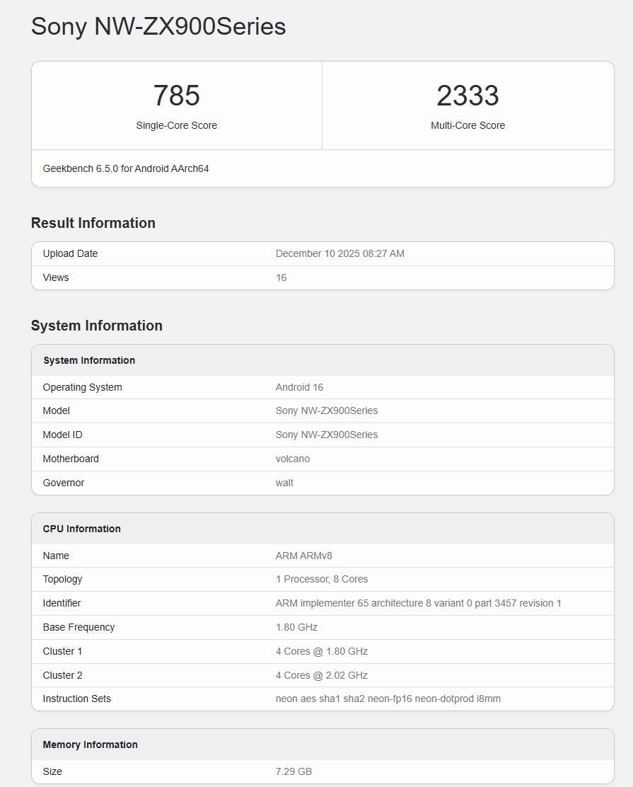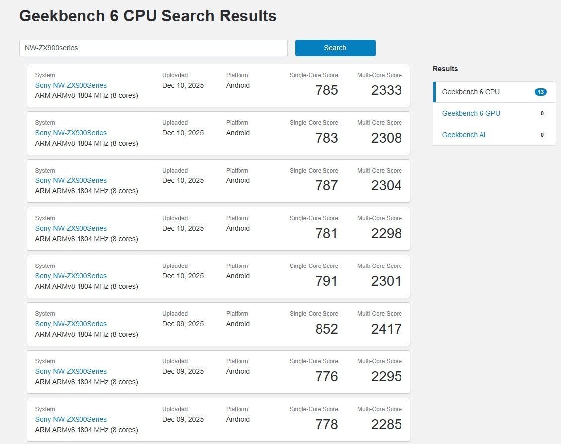 Geek Bench資料庫自2025年12月初就陸續出現多筆代號Sony NW-ZX900Series的裝置測試數據,而Sony的NW系列產品通常是代表Walkman產品,加上使用ZX900的型號,沒意外是現行NW-ZX700系列後繼的高階機型。