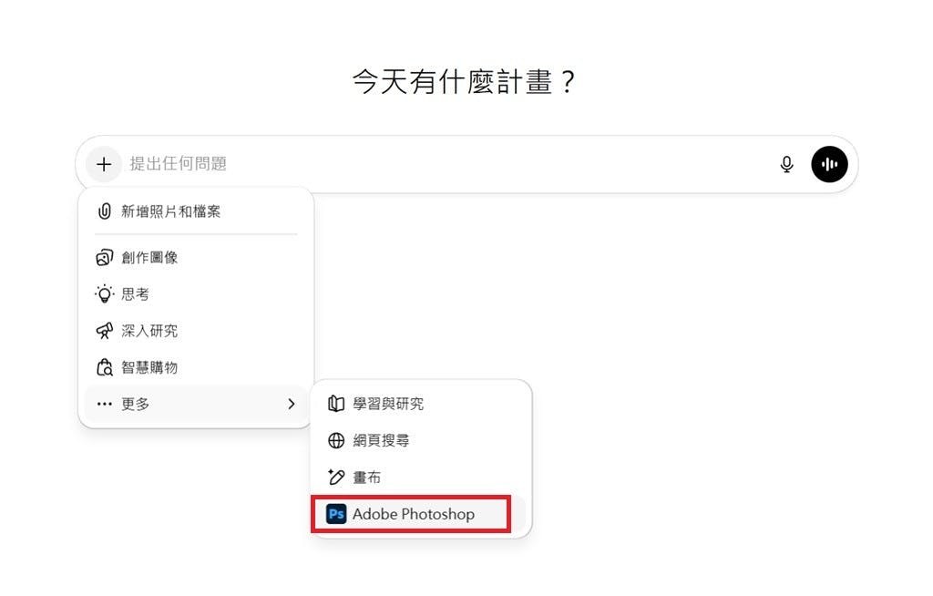 ▲在完成連接後,用戶於ChatGPT的聊天設定選項裡,可以看見Photoshop模式。
