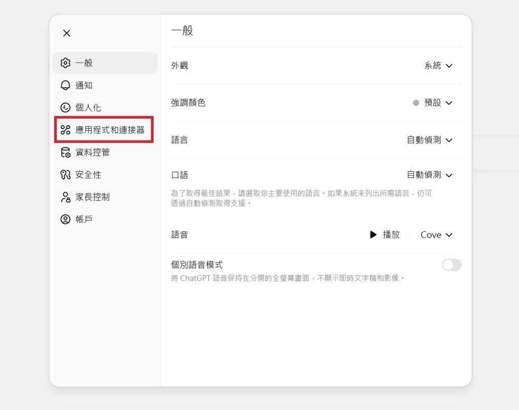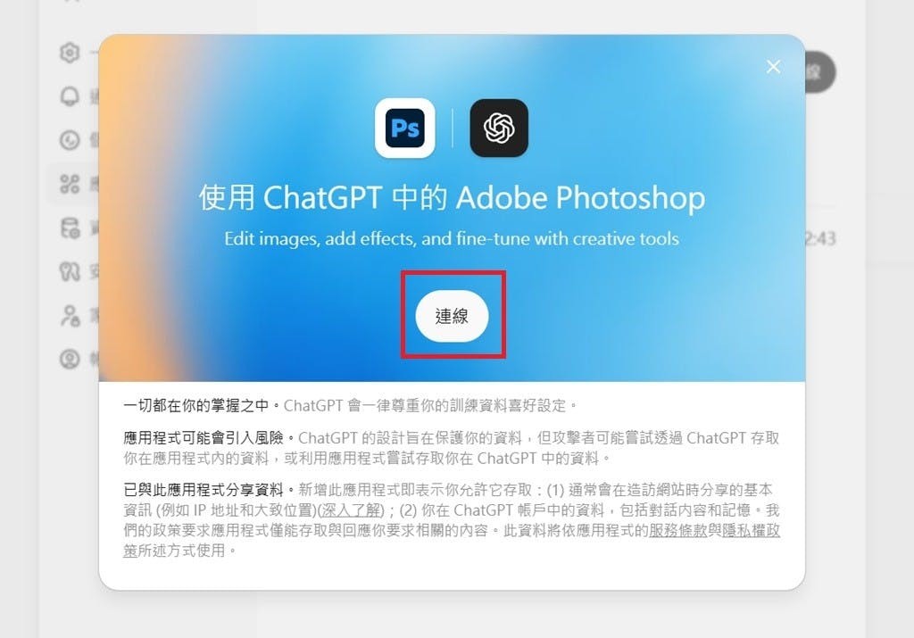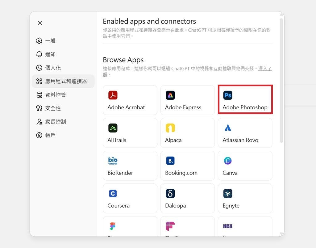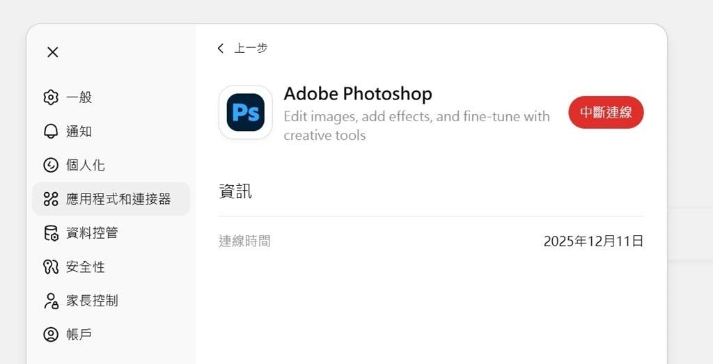 ▲如果沒有要繼續使用Photoshop功能,Photoshop與ChatGPT的連線可以隨時中斷。同樣前往「設定」中的「應用程式和連接器」欄位中調整即可。