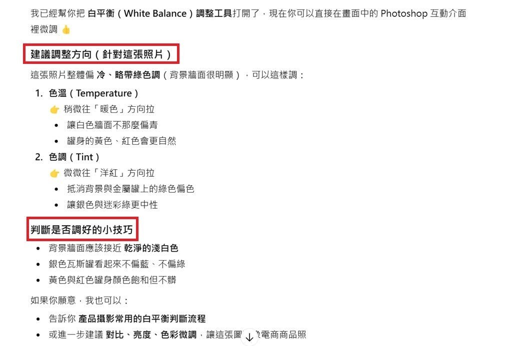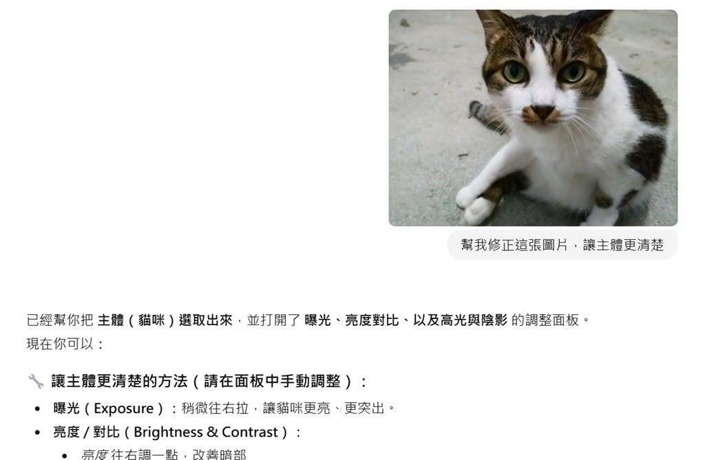 ▲ChatGPT的角色像是修圖指導,將會告訴用戶修圖的步驟,該怎麼調整才能讓圖片變好,也會告知用戶判斷調整方向的方法。