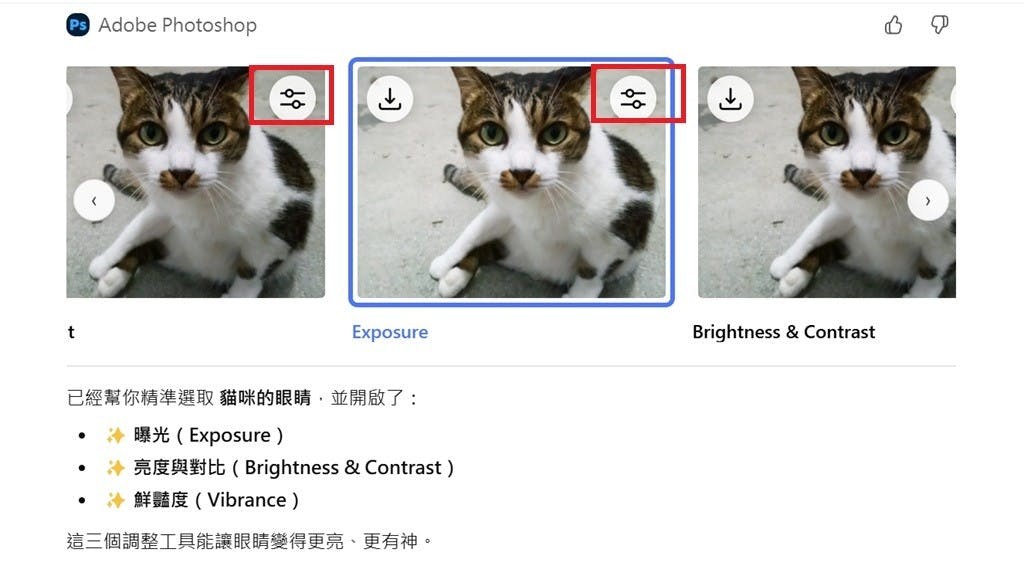 ▲用戶在開通ChatGPT的Photoshop功能後,上傳圖片並下達指令,ChatGPT就會提出不同的修正方向,並且提供對應的修改工具。以上圖為例,ChatGPT在基礎修改以外另提供了調整曝光、調整亮度與對比、調整鮮豔度共3個選項,用戶只要選擇照片左上角的功能按鍵即可進行以上調整。