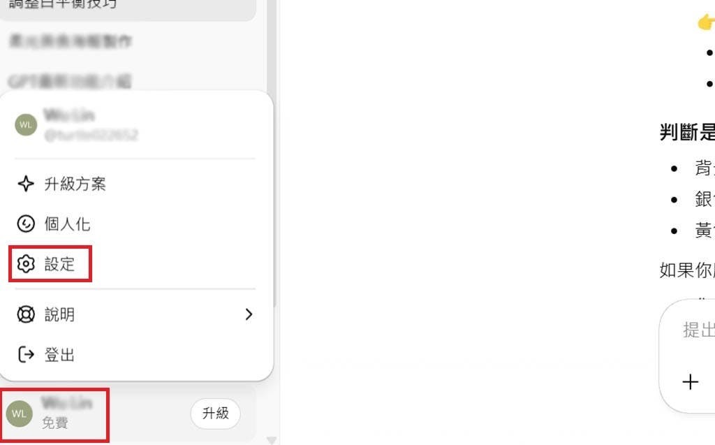 ▲想要開啟ChatGPT的Photoshop功能,用戶可以點選左下角的個人選項進入「設定」欄位。