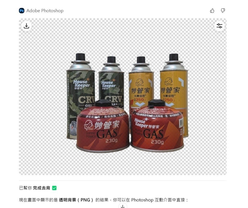 ▲較為單純的指令例如去背等,ChatGPT可以代為執行,用戶同樣能夠跳轉至Photoshop網頁版繼續編輯。