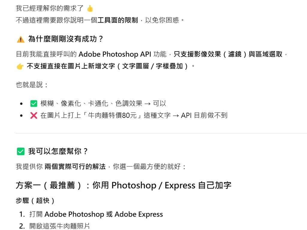 可能用戶會希望ChatGPT的Photoshop功能可以用AI生成圖片再編輯,不過目前此功能著重在調整色彩、圖片去背等,以修圖為主,無法提供創造功能,因此用戶將無法下達例如「運用此圖片製作成宣傳海報」或者是「在圖片上放標語」等類似的提示詞。ChatGPT將無法繪製新圖片,但是會以步驟解說的方式告知用戶在開啟Photoshop後該如何操作,或者是該使用哪個Adobe應用程式。