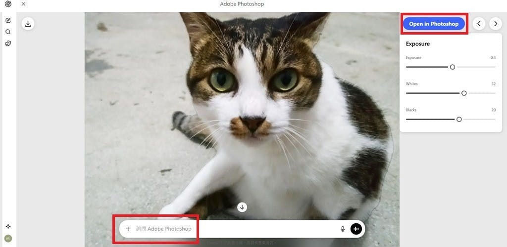 ▲假設選擇「調整曝光」,點選功能按鍵後就會進入簡易編輯頁面。用戶可以透過下方的訊息欄進行圖片下一步修改,也可以點選右上角的「Open in Photoshop」進入Photoshop網頁版進階編輯。調整後點選左上角的下載按鍵即可下載。
