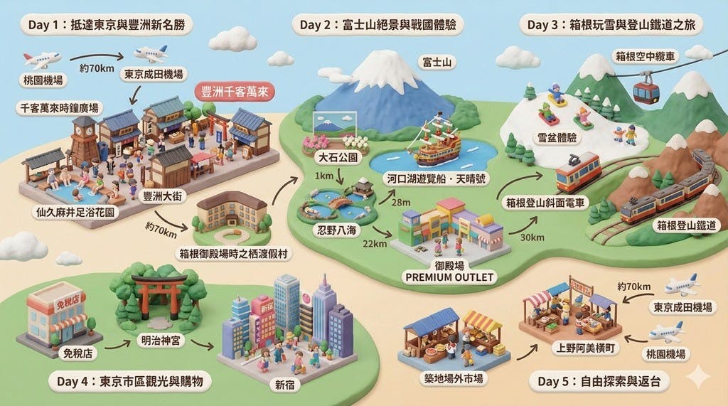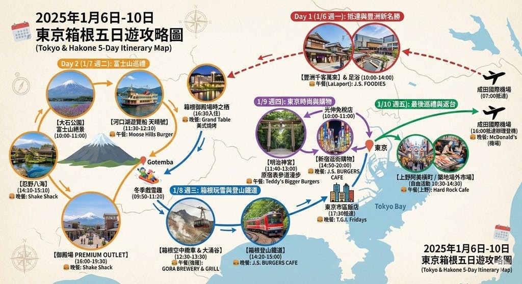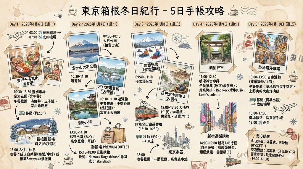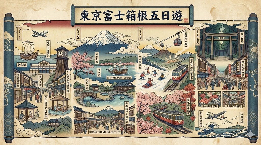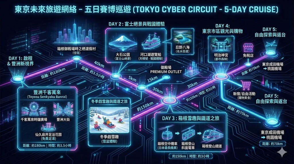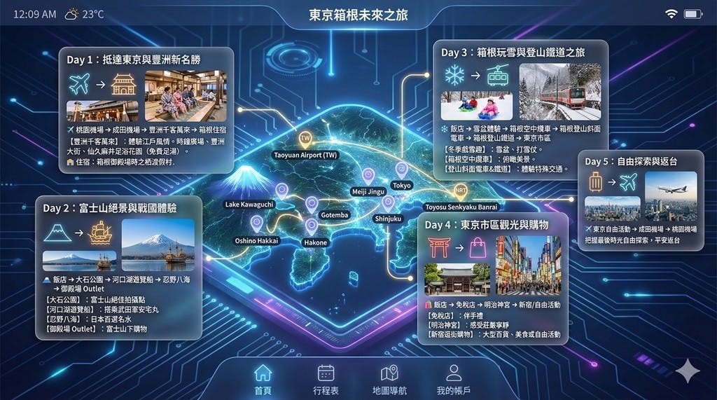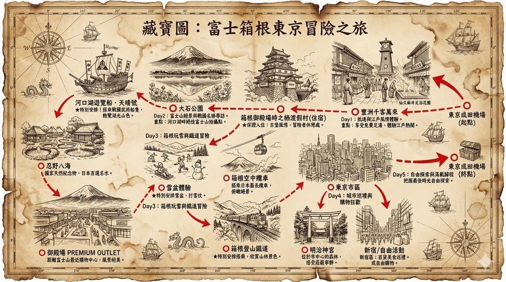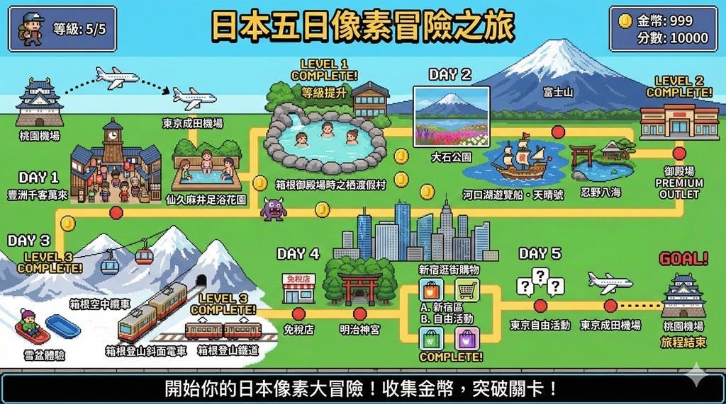 ▲黏土風格旅遊圖把景點縮小擺在地圖上,可以要求Gemini標示出每個行程之間的距離或是交通時間。適合繪製旅遊行程重點摘要,如果想要詳細列出餐廳、確切時間會較不適合。▲跨國旅遊時,如果要求標註起點與終點例如桃園機場出發、抵達桃園機場,可能會讓地圖內容變得擁擠。因此可以考慮將起點和終點刪除,設定出發點為國外機場,省略飛行的部分。 ▲Gemini能夠把旅遊行程模擬成遊戲關卡,適合強調重點行程內容,但不適合加入過於詳細的行程資訊。▲如果行程路徑方向較為單純,使用遊戲風格的旅遊地圖可以獲得不錯的成果。 ▲用戶也可以使用旅遊目的地的傳統繪畫方法製作旅遊地圖,例如前往日本旅遊時繪製浮世繪風格旅遊地圖、前往中國旅遊時繪製水墨風格旅遊地圖等。▲浮世繪風格的旅遊地圖適合分享參訪景點,較不適合加入過於詳細的旅遊資訊。 ▲如果想要在圖片中加入較多資訊,在行程數量較少的情況下,可以嘗試藏寶圖風格。可以要求Gemini僅繪製重點行程,其餘注意事項以小字標註。▲用戶可以在藏寶圖中加入地圖元素,並要求Gemini把景點的實際位置標記出來。 ▲如果行程的數量較多,或者是想要把許多詳細資訊標記在地圖上,可以使用科技風格的旅遊地圖。以地圖為中心,分別用線條引導出各天行程與注意事項。▲用戶也可以自行設計介面,或者是要求加入像是手機App的功能按鍵。 ▲如果旅遊行程有明確的主軸,例如鐵道巡禮、公路旅行等,可以將路線作為地圖主軸,介紹沿途的各個景點。▲以路線為主軸的旅遊地圖適合較為細碎的行程,如果行程項目較少,或者以前往少數區域參觀為主,可以要求Gemini加入更多旅遊細節,讓畫面更豐富。 ▲手帳風格的旅遊地圖受到許多人的喜愛,可以結合拍立得風格讓照片放大展示,照片的內容主題也可以要求景點、美食、風景等。▲拍立得手帳風格適合加入詳細的行程說明,包括時間和餐廳。