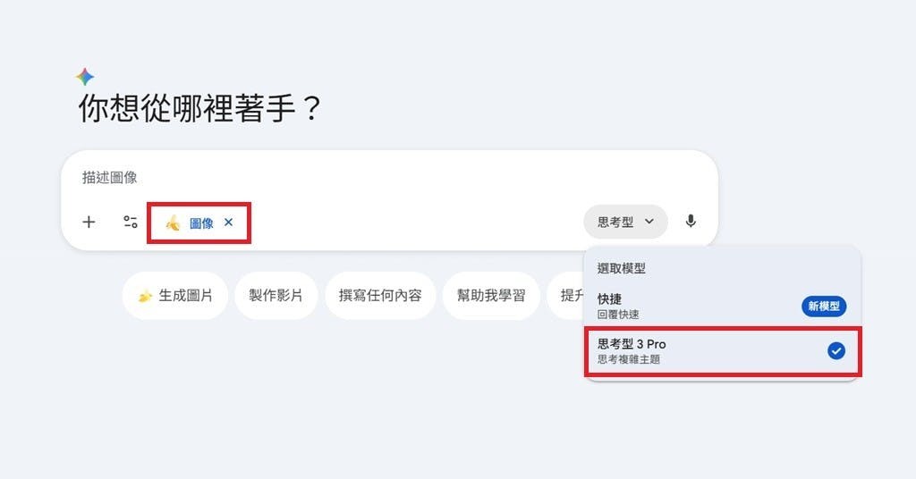 在規劃好旅遊行程後,用戶可以將行程貼進Gemini對話框,只要在行程前面加入簡單的提示詞就可以讓Gemini繪製出完整的旅遊地圖。而在繪製前,別忘了將Gemini模型調整至「圖像」和「思考型」模式,如果發覺圖片無法精準呈現繁體中文,可能是模型沒有調整成功導致。
