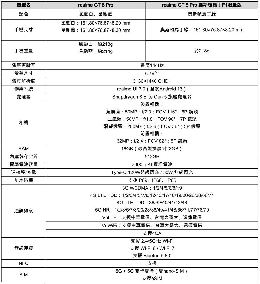 ▲realme GT8 Pro重點規格