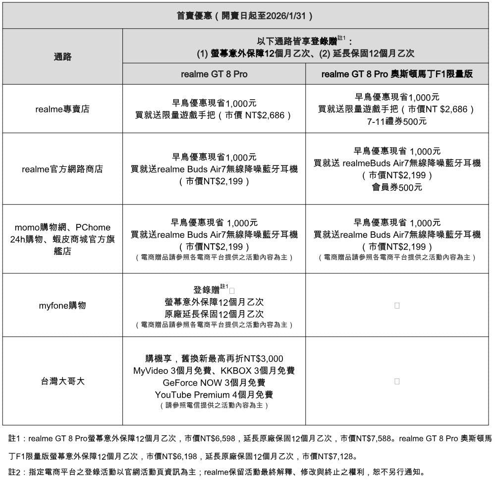 realme GT8 Pro即日開放預購,12月26日開賣,提供單一16GB RAM+512GB規格,具備「風動白」及「星馳藍」兩款基本色,建議售價為30,990元;採用「奧斯頓馬丁綠」的Aston Martin F1版建議售價為32,990元,即日起開放預購,2025年12月26日正式限量開賣。於2026年1月31日購入realme GT8 Pro或GT8 Pro Aston Martin F1限量版,加贈螢幕意外險12個月1次以及延長保固12個月,此外於不同通路加贈藍牙耳機或遊戲手把等不同配件。