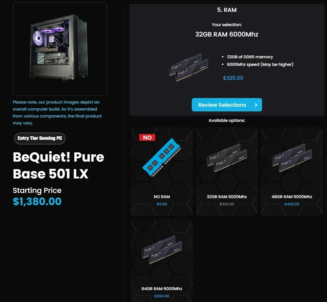 多半客製化主機都是提供完整的規格配置,採取整機安裝完成後出貨,然而由於記憶體價格波動明顯,可能擔心消費者因此影響購買意願,美國Paradox Customs乾脆開放可不安裝記憶體的配置,建議持有記憶體或是有管道拿到相對便宜的記憶體的玩家可選擇此版本減少價格;在Paradox Customs的網站上,選擇32GB的DDR5 6000MHz記憶體要價高達325美金,若對比4個月前台灣的售價幾乎飆漲3倍,且還無法確定後續還會漲到多高。