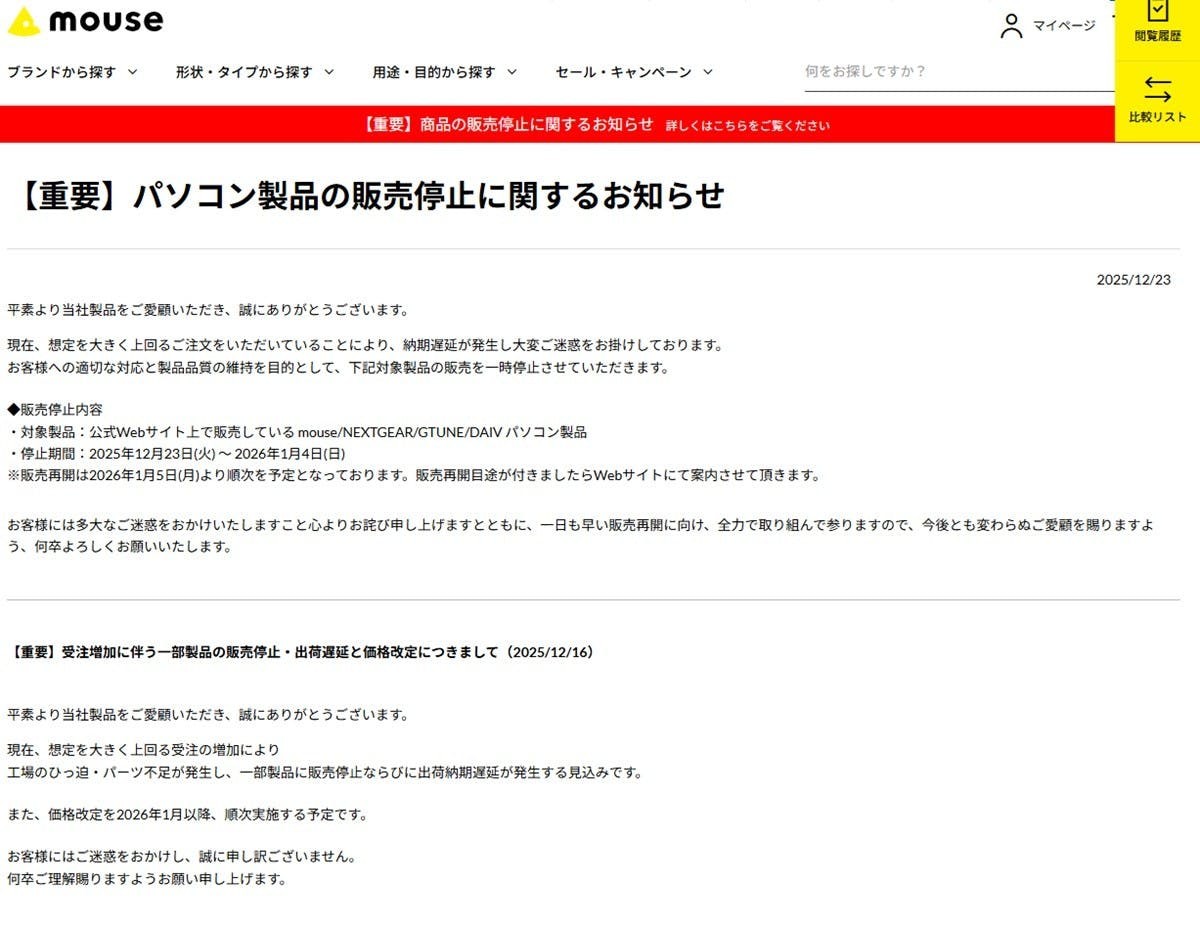 ▲日本電腦品牌Mouse原本只是宣布停售部分產品,後續全面暫停接單並預告2026年初漲價