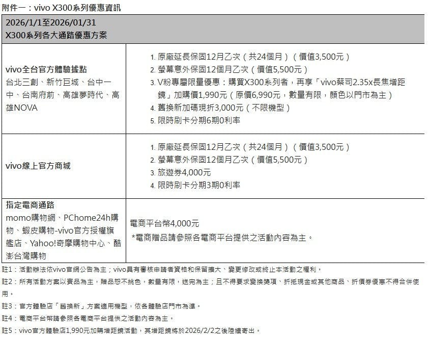 適逢年末包括演唱會、跨年等大型藝文活動將吸引用戶對高品質長焦相機的需求,vivo宣布至2026年1月31日為止,在官方體驗店祭出1,990元加購增距鏡套組的優惠,同時指定機型舊換新最多可享加碼線折3,000元的回饋。官方商城以及主要店商平台則同步加碼提供4,000元旅遊回饋或平台幣。