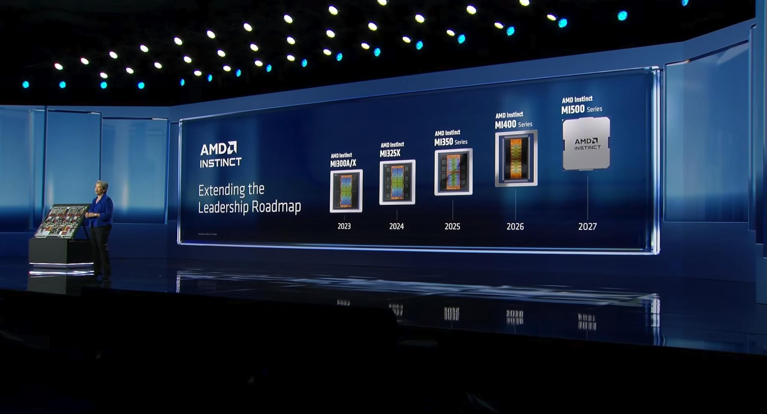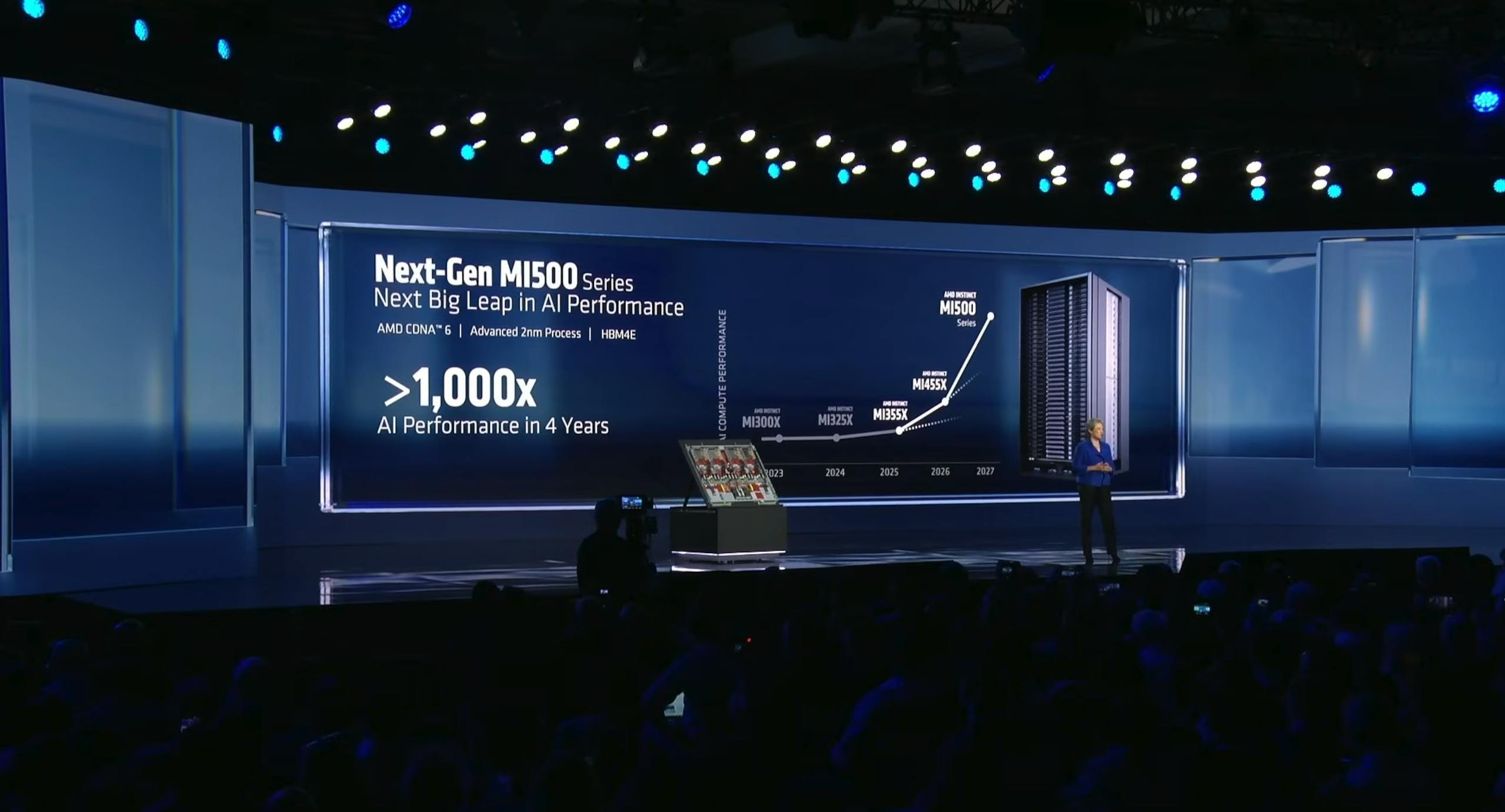 酷的是,蘇姿丰也在今日提前亮相正在開發的 MI500 系列,該系列將基於最新的 CDNA 架構、採用 2 奈米製程技術,並改用更高速度的 HBM4E 記憶體。預計於 2027 年推出,其目標是在四年內達到 1,000 倍的 AI 效能增長。